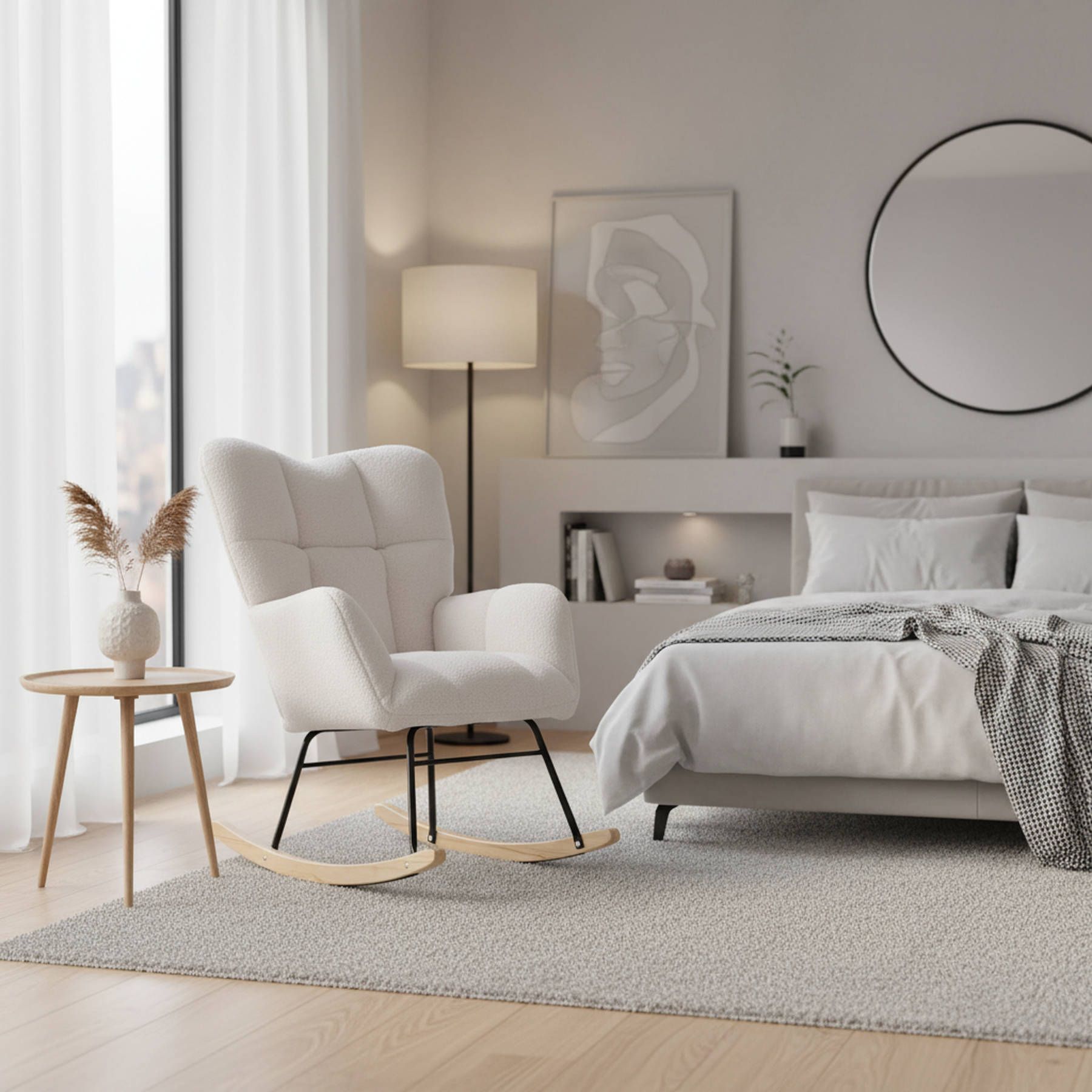 • Plush Bouclé Upholstery with Modern Tufting: This rocking chair boasts a contemporary design defined by its soft, inviting bouclé fabric in a warm off-white tone. The generous padding is accentuated with stylish square tufting on the backrest and seat, creating a cozy, cloud-like aesthetic that perfectly merges comfort with modern design. The contrasting black metal frame and natural wood rockers complete its chic, inviting look.