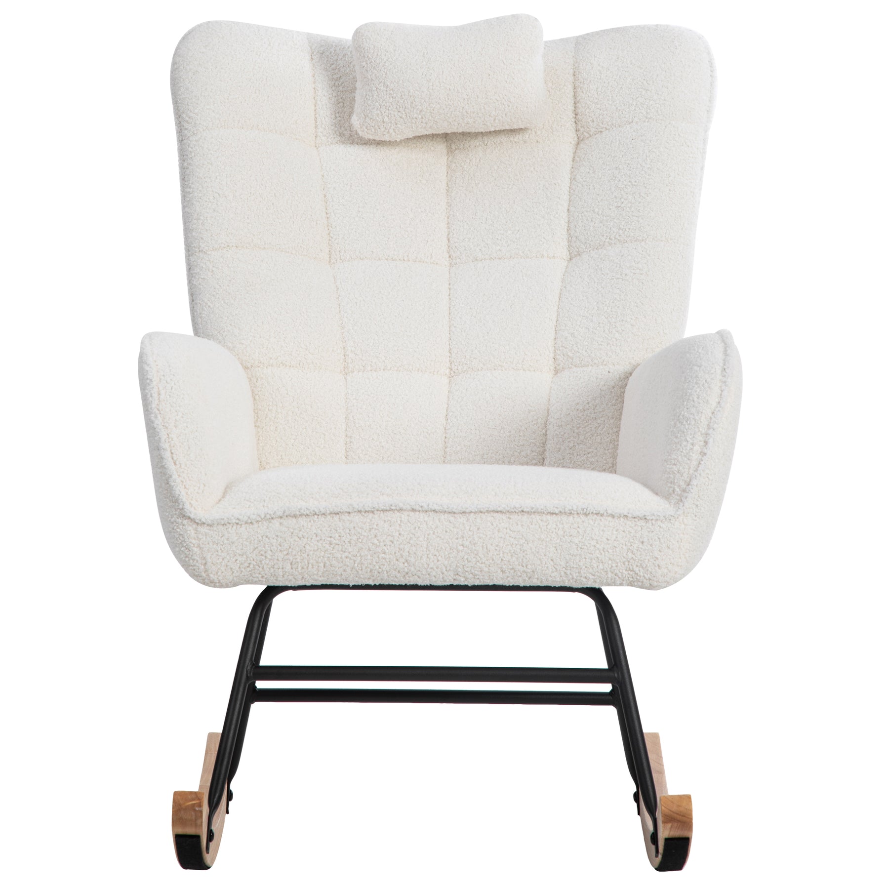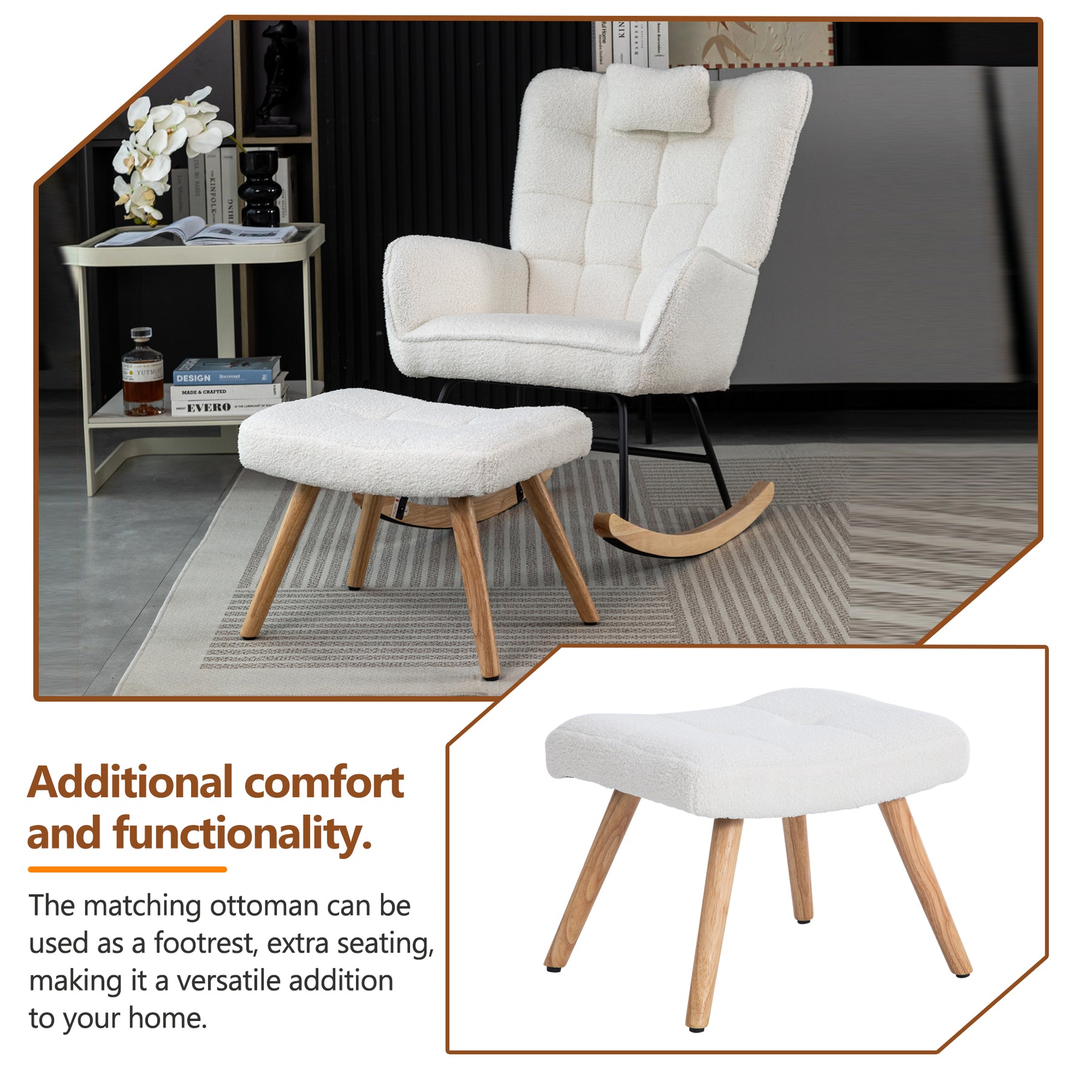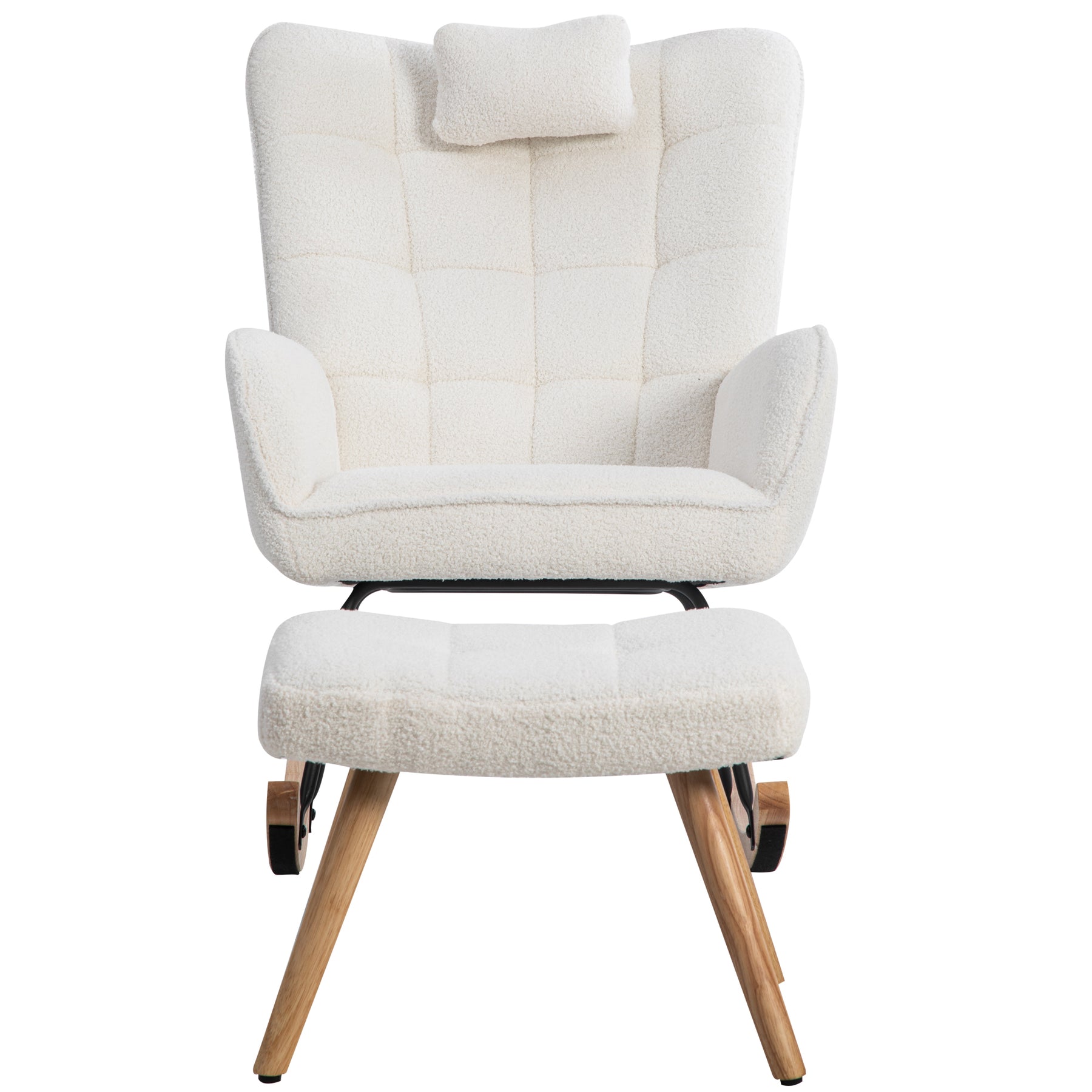 White bouclé fabric rocking chair with footstool and neck pillow PHLOEM