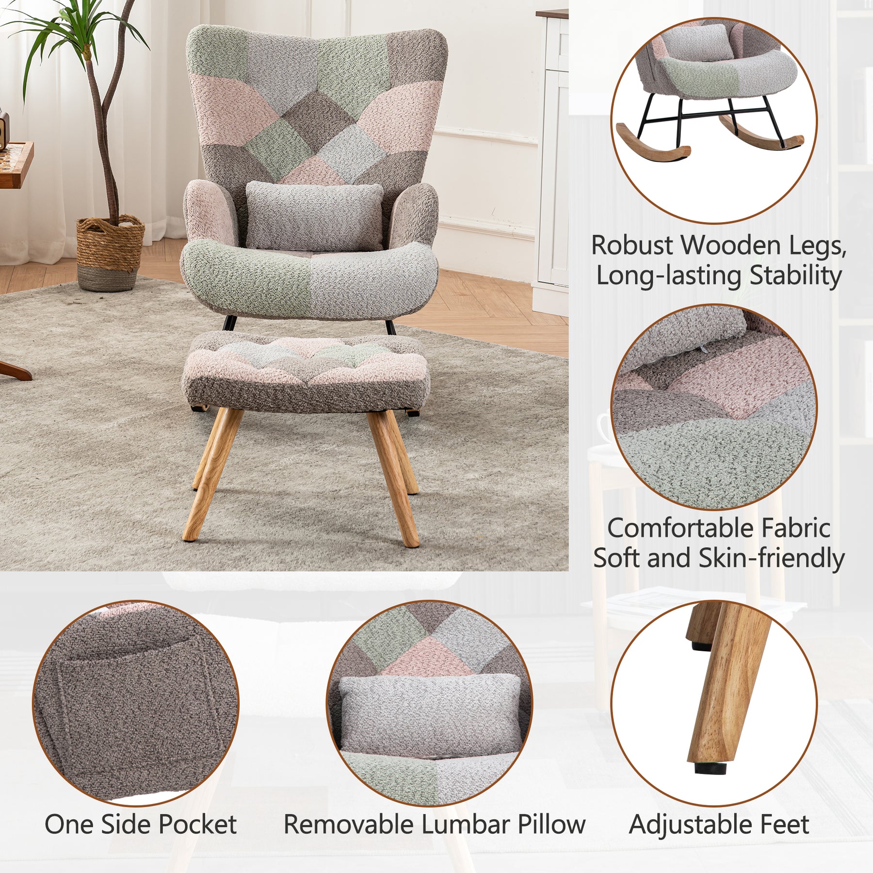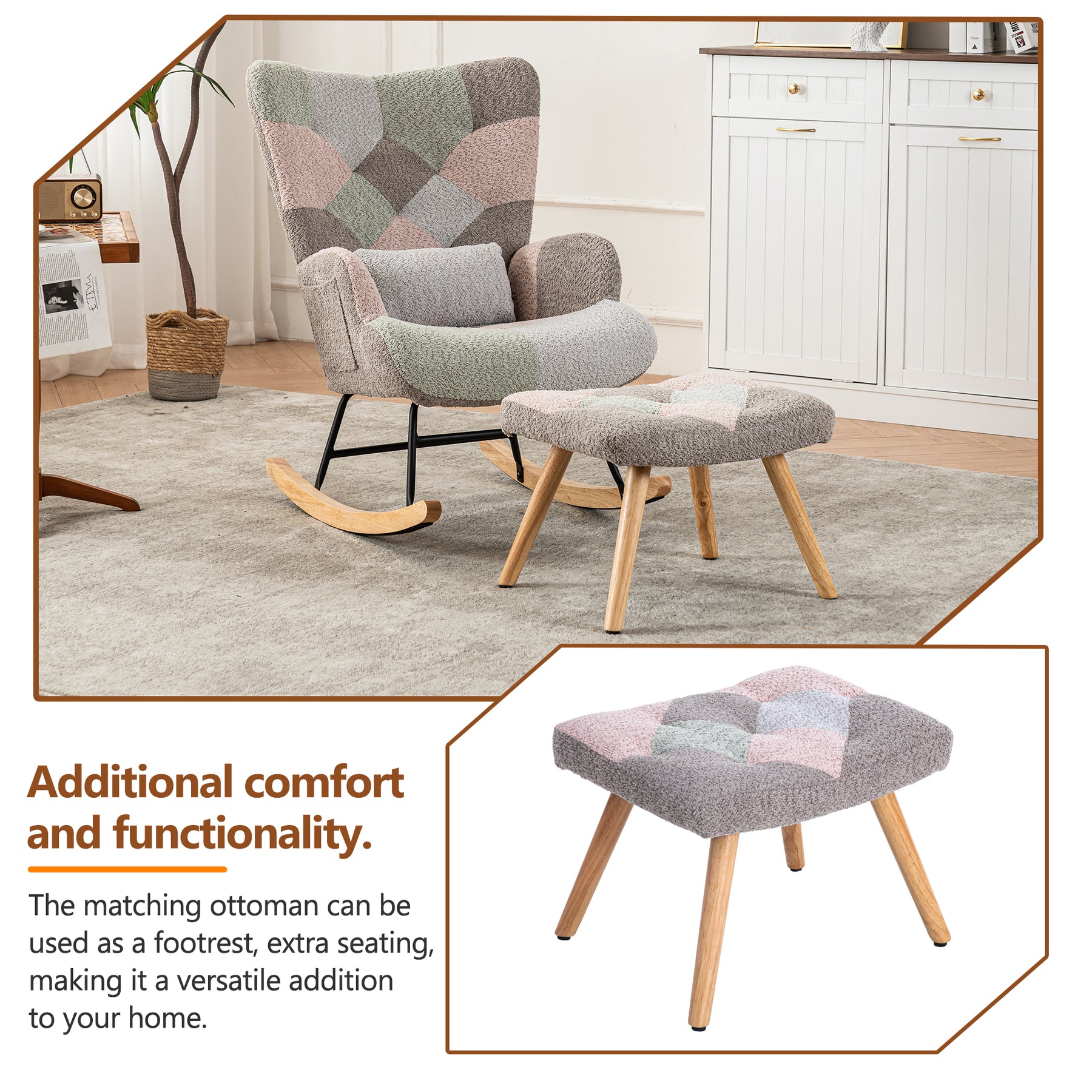Patchwork rocking chair with footstool, bouclé fabric accent chair with wooden legs and cushion RECTRIX