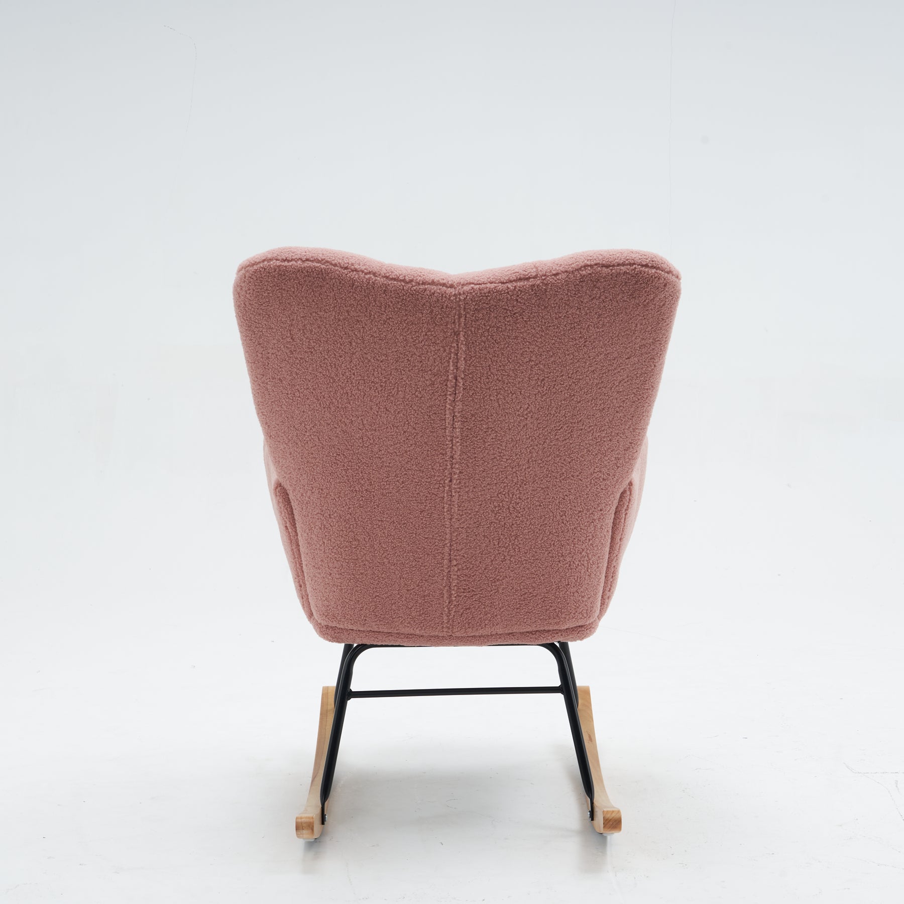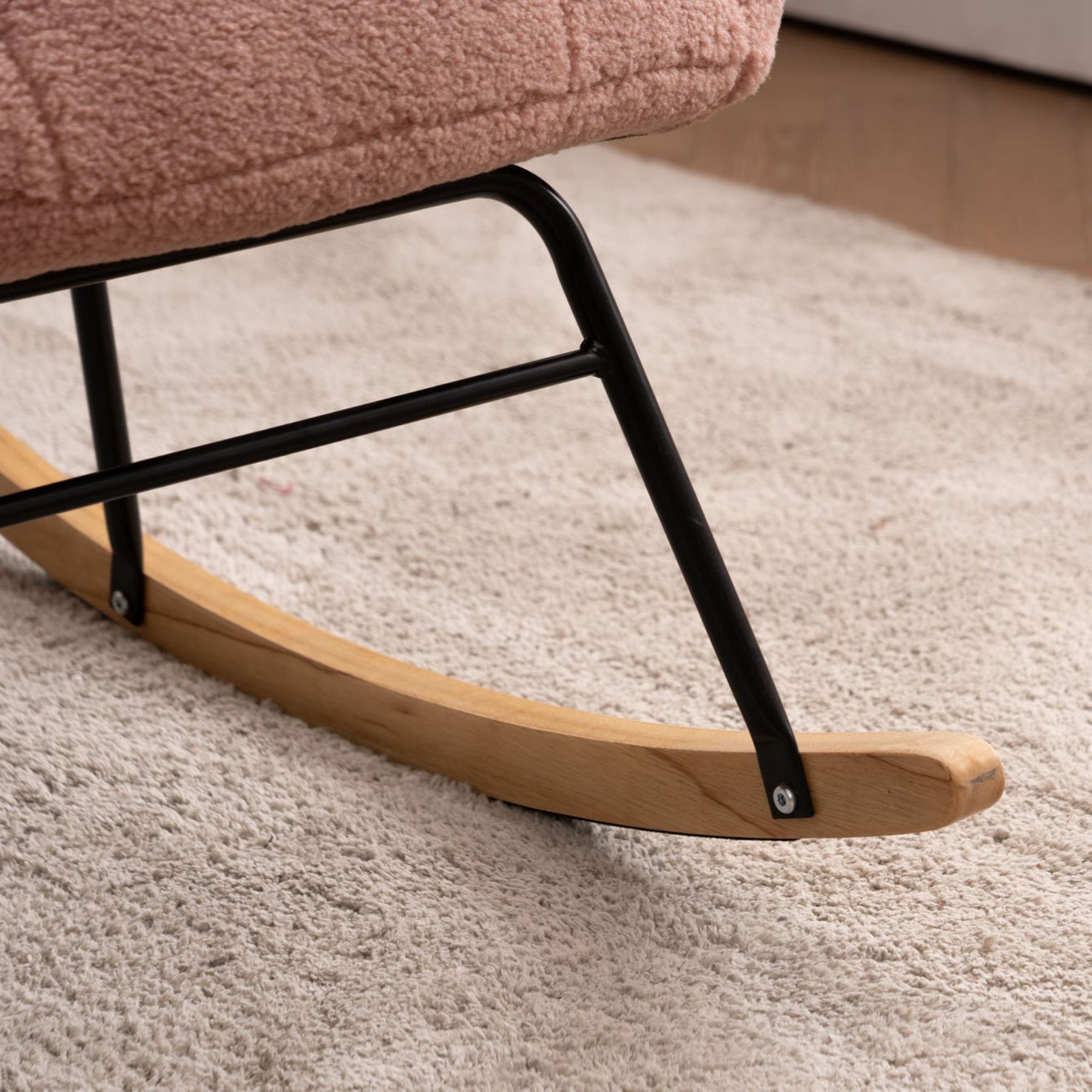 Create a cozy corner where you can relax with this rocking chair. The armchair is covered with Rose Teddy Bear Boucle fabric, and the decor is very stylish and modern. The armchair is mounted on wooden slides and has a smooth rocking function, which is perfect for relaxing in the bedroom or living room. Whether in your living room, bedroom or reading room, our armchairs will fit perfectly into any type of decoration, no matter what the color scheme of your interior. Our armchairs will not only enhance your interior decoration, but also ensure your well-being. Due to its color and design, it can match a variety of interior design styles, from vintage to modern.
