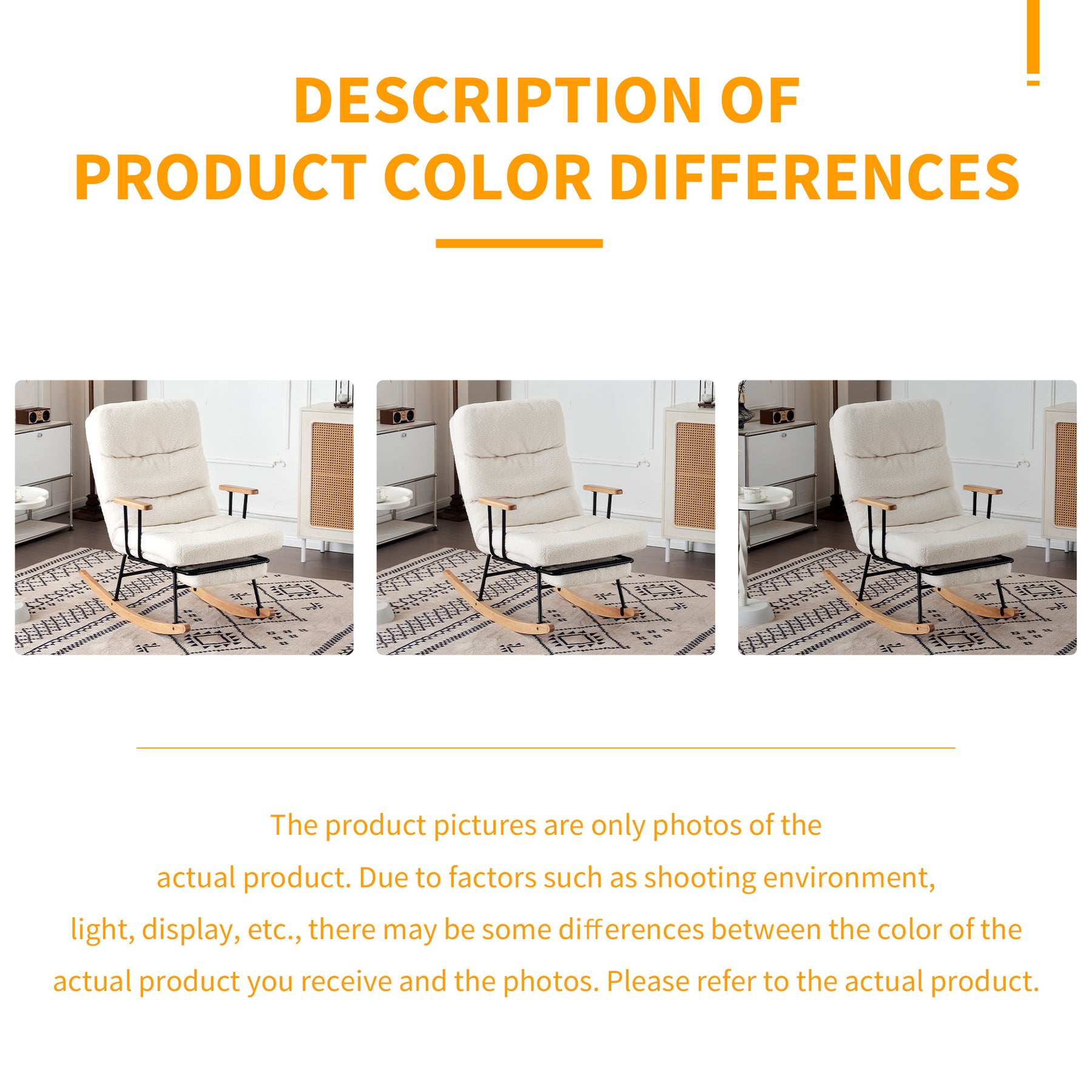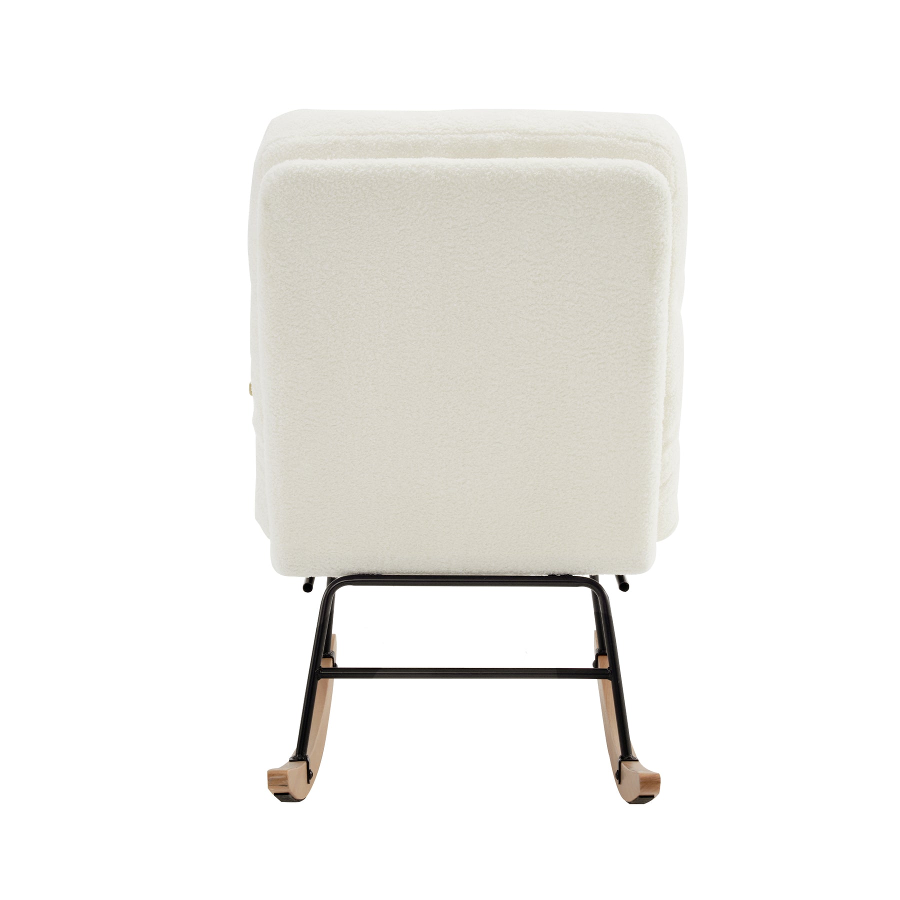 Indulge in a moment of pure relaxation with this modern rocking chair, designed with a gentle, soothing rocking motion. Upholstered in a soft boucle fabric, this chair features a wide seat and a high backrest for ultimate comfort and support. The adjustable recliner and accompanying footrest allow you to customize your lounging experience. With a stylish tufted design and a sturdy wood base, this rocking chair is the perfect addition to your living room or bedroom.