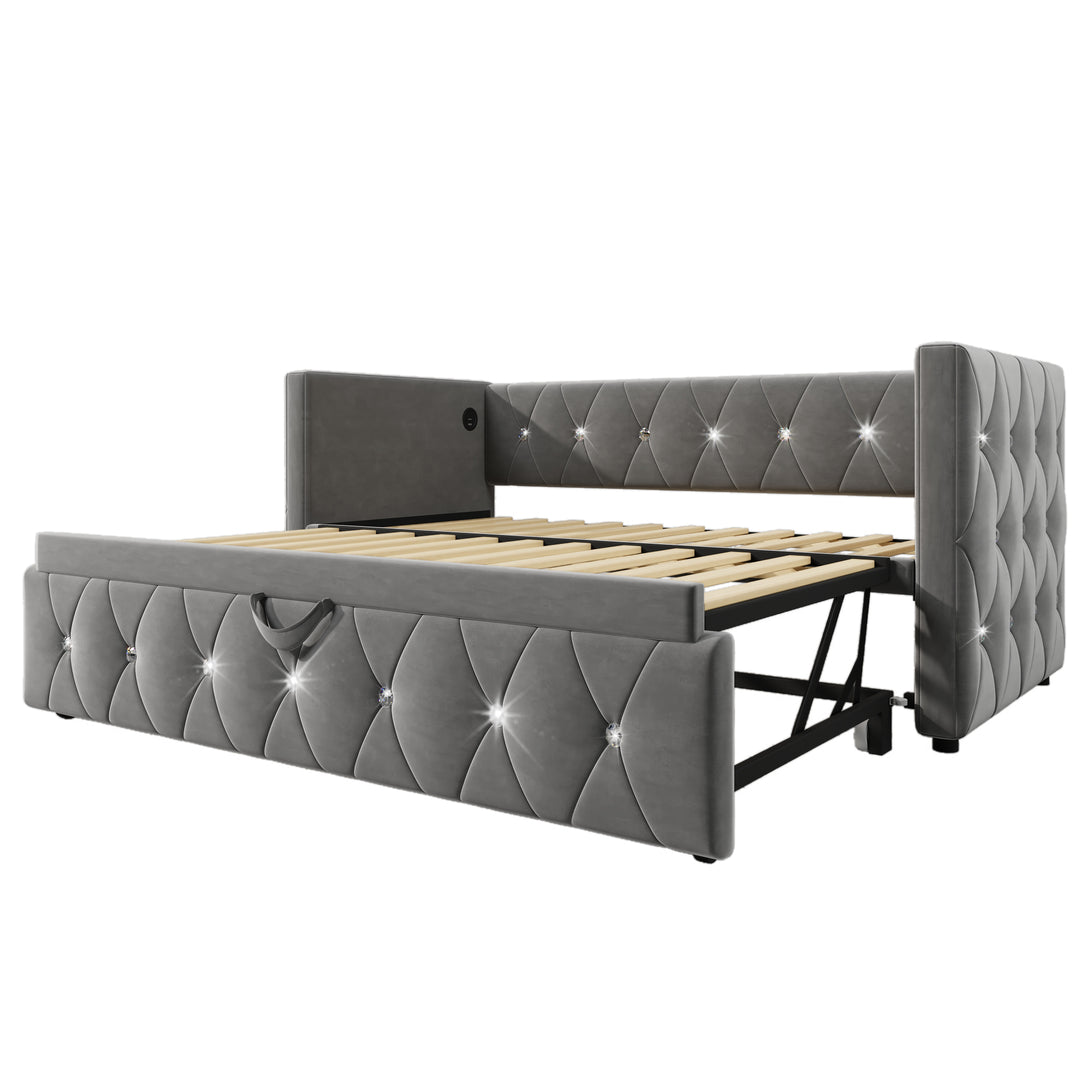 Grey velvet single upholstered guest day bed diamond design with trundle, USB charging STEKZEL GREY UK