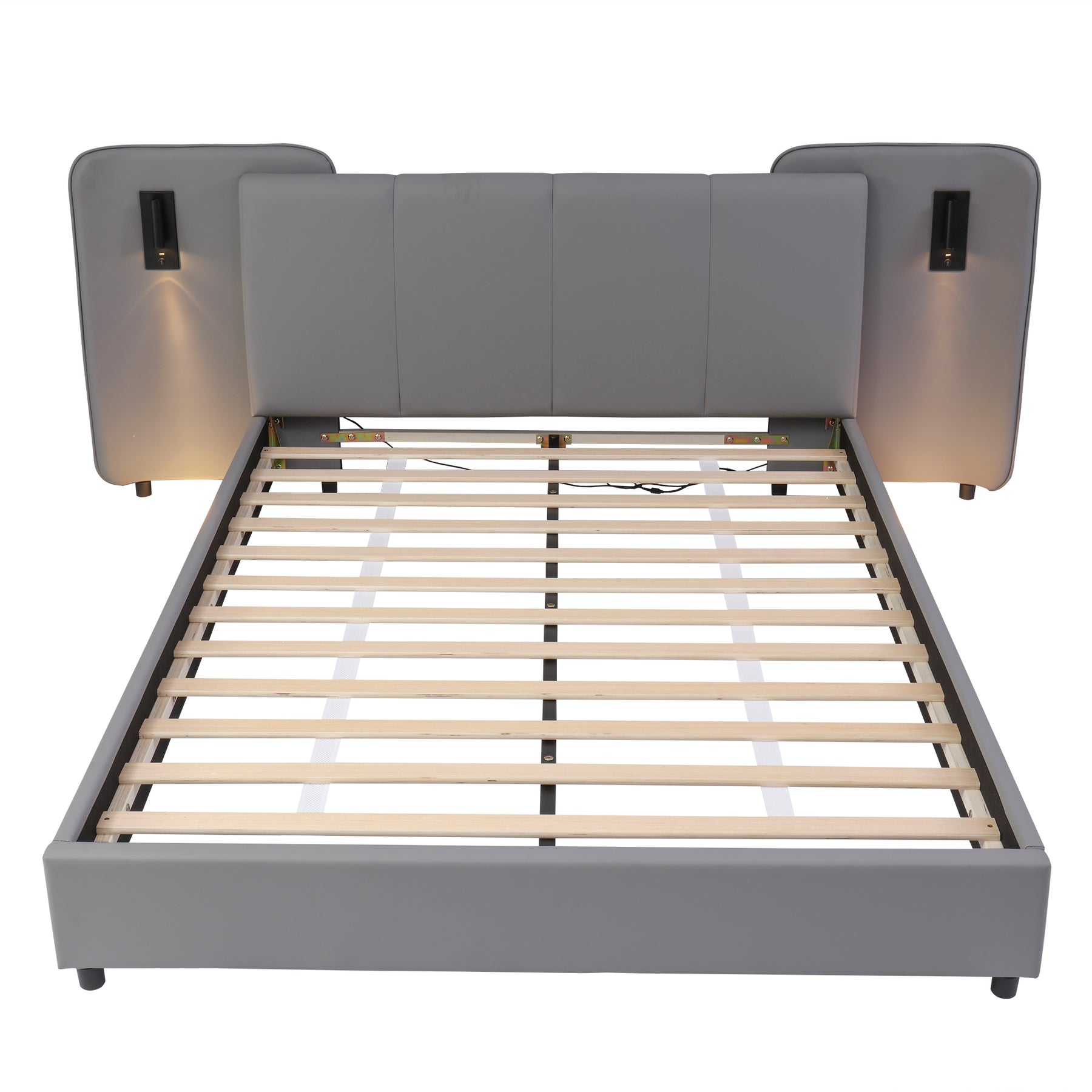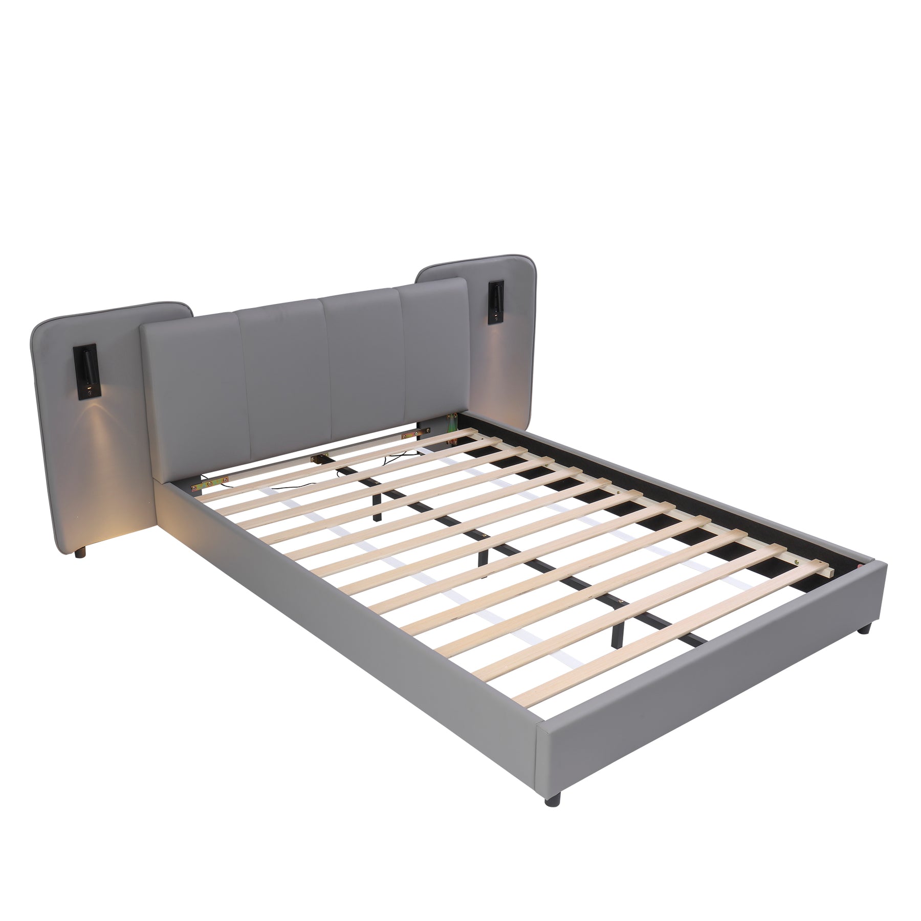 Grey PU upholstered double bed with charging port, 2 bedside lamps 135×190cm PASTUREBEARD