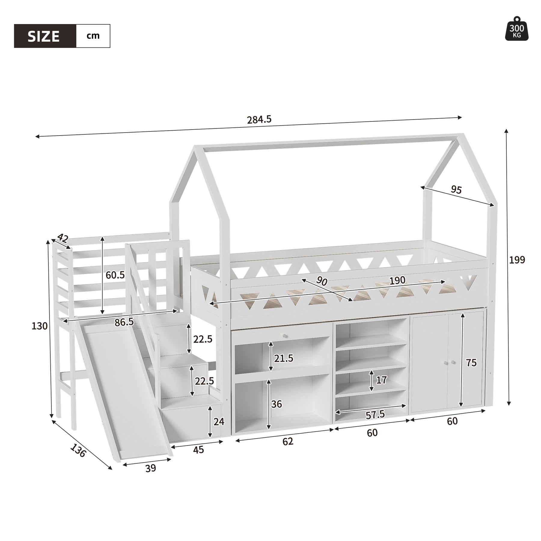 White wooden loft children single bed with slide, stairs, and storage (90x190cm) N606W0003W
