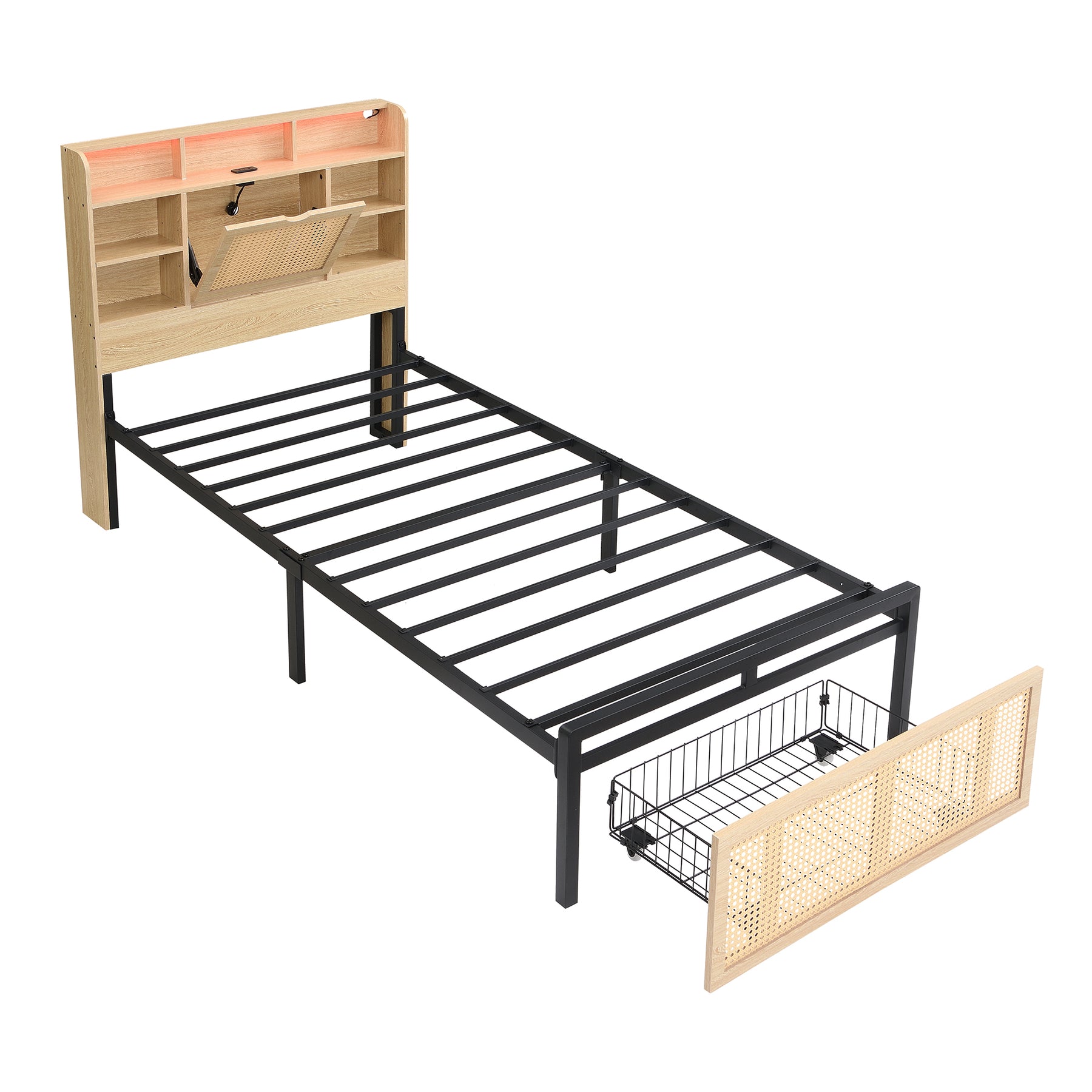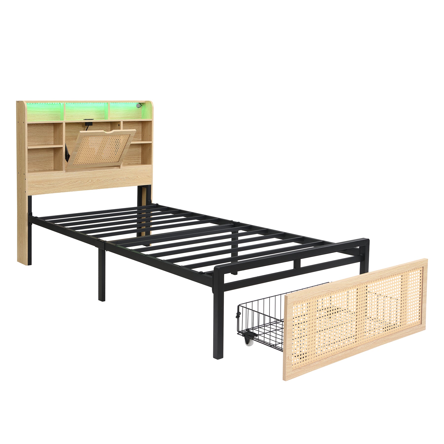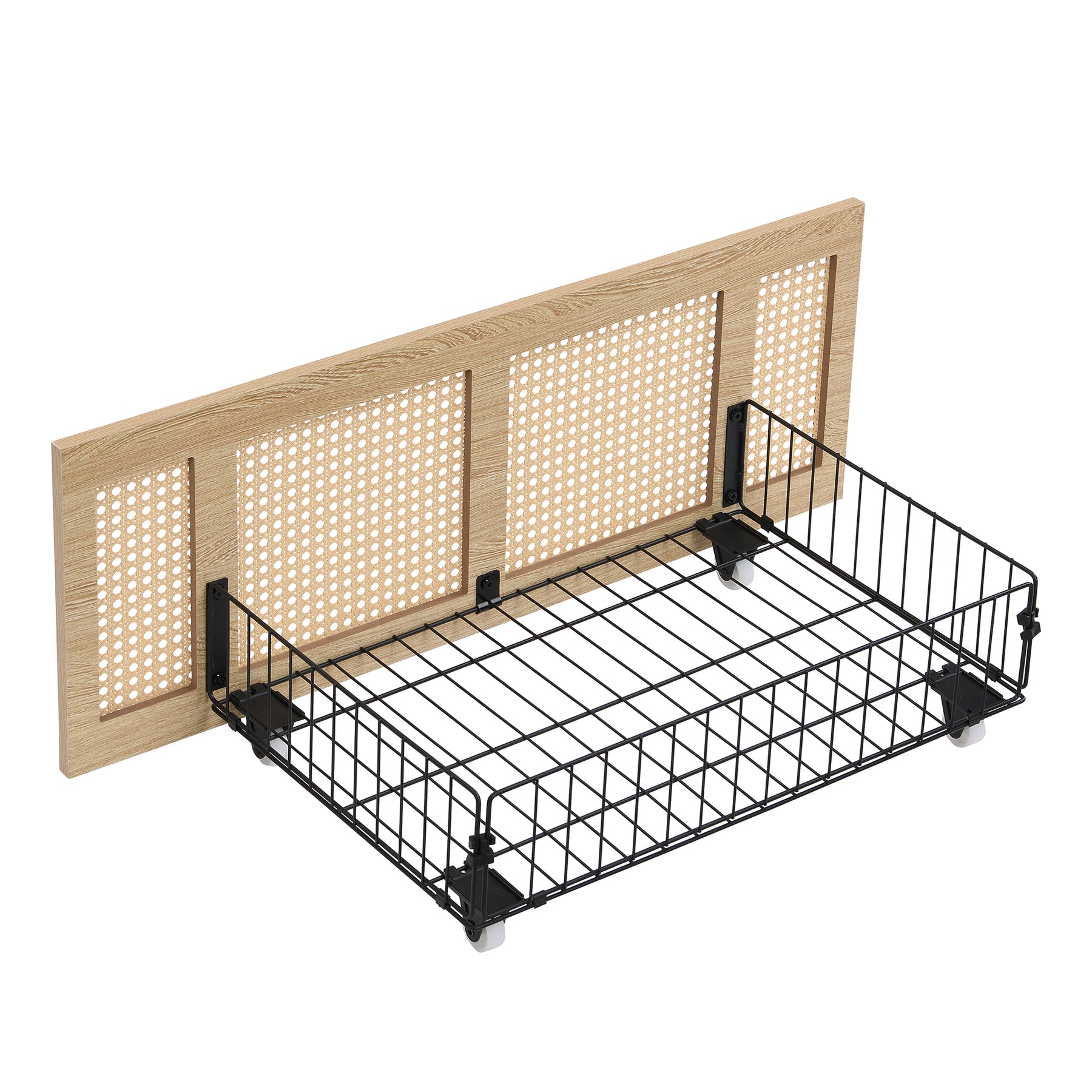 The headboard incorporates practical storage compartments for books, glasses, phones or nighttime essentials, while the built-in charging port and LED strip light offer added comfort and functionality. At the foot of the bed, a PE rattan-style drawer on wheels provides smooth-access hidden storage for linens or clothing without taking up extra room. Crafted from MDF and iron, this bed delivers dependable daily support with a timeless design.