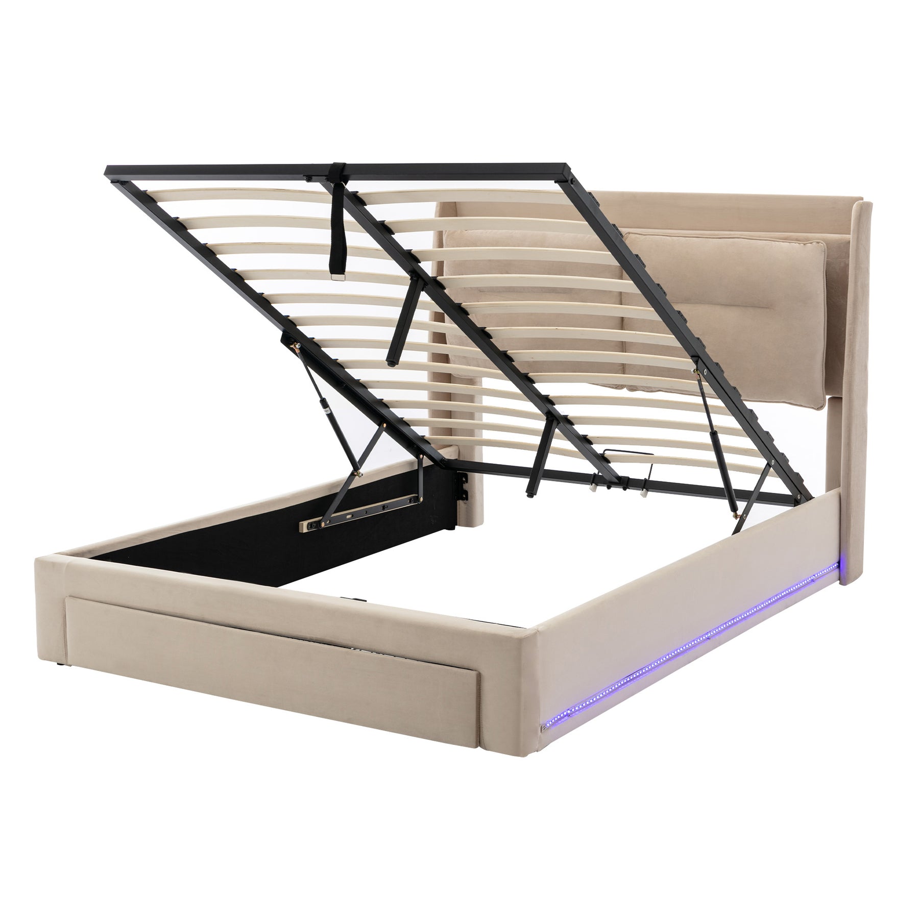 Beige velvet upholstered storage gas lift bed with drawer and LED light (150*200cm) BOVU BEIGE KING UK