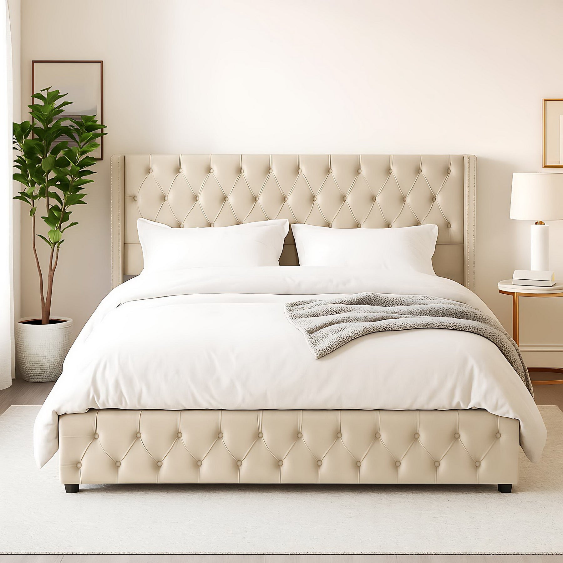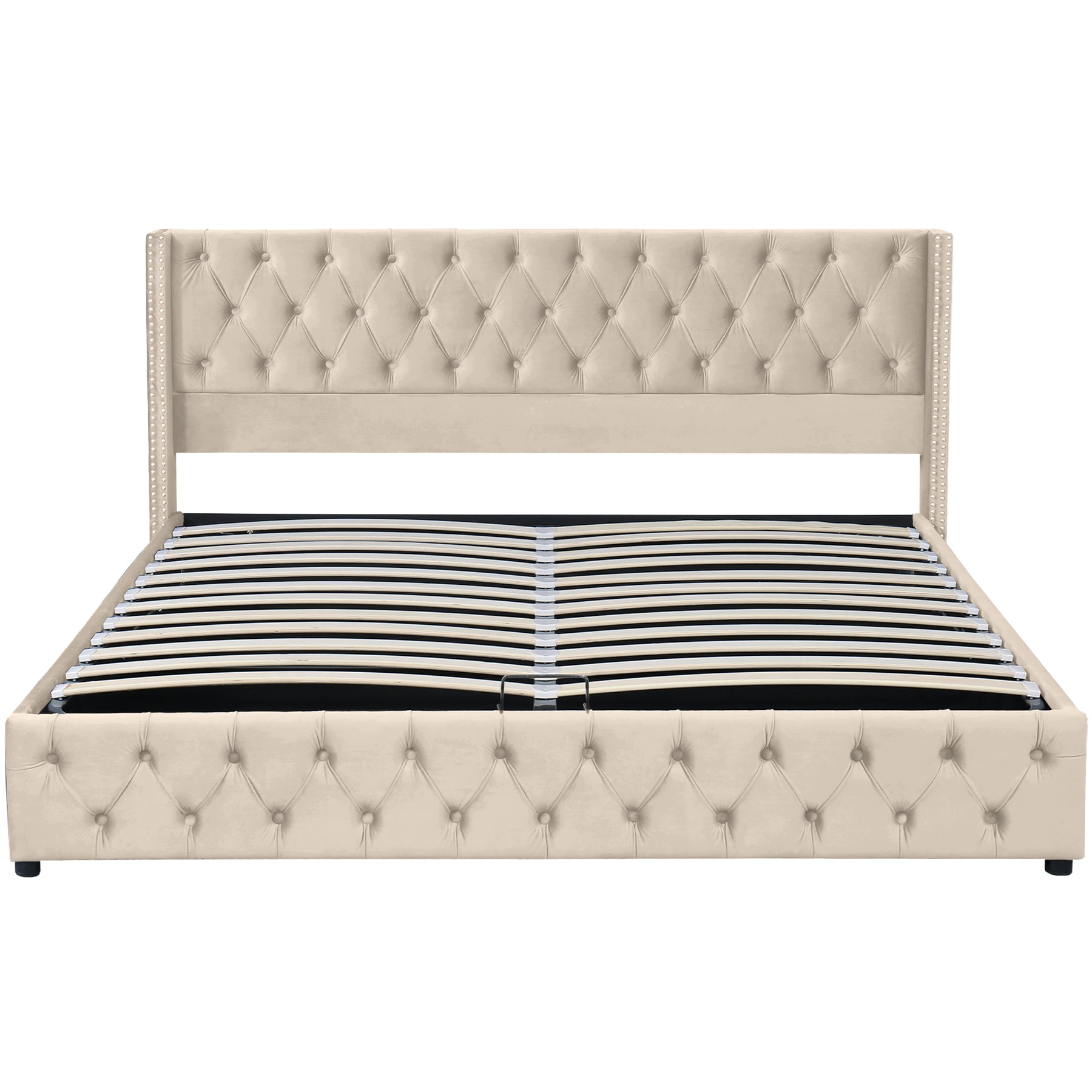 Chesterfield beige velvet upholstered storage gas lift bed (150*200cm) AZONS BEIGE KING UK