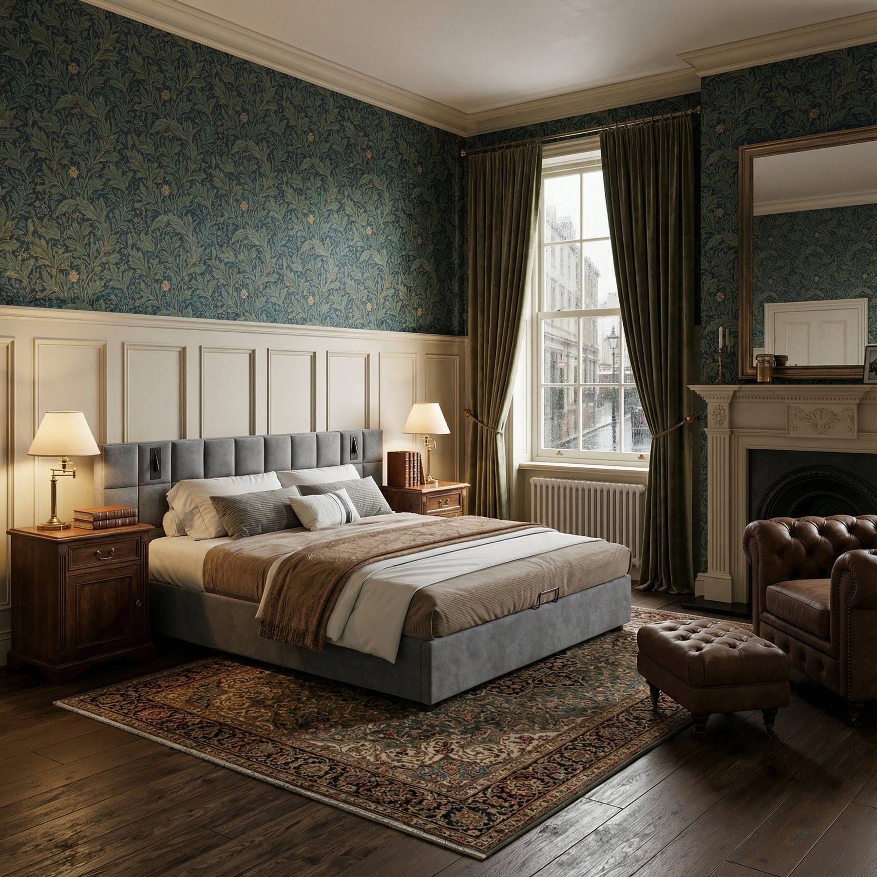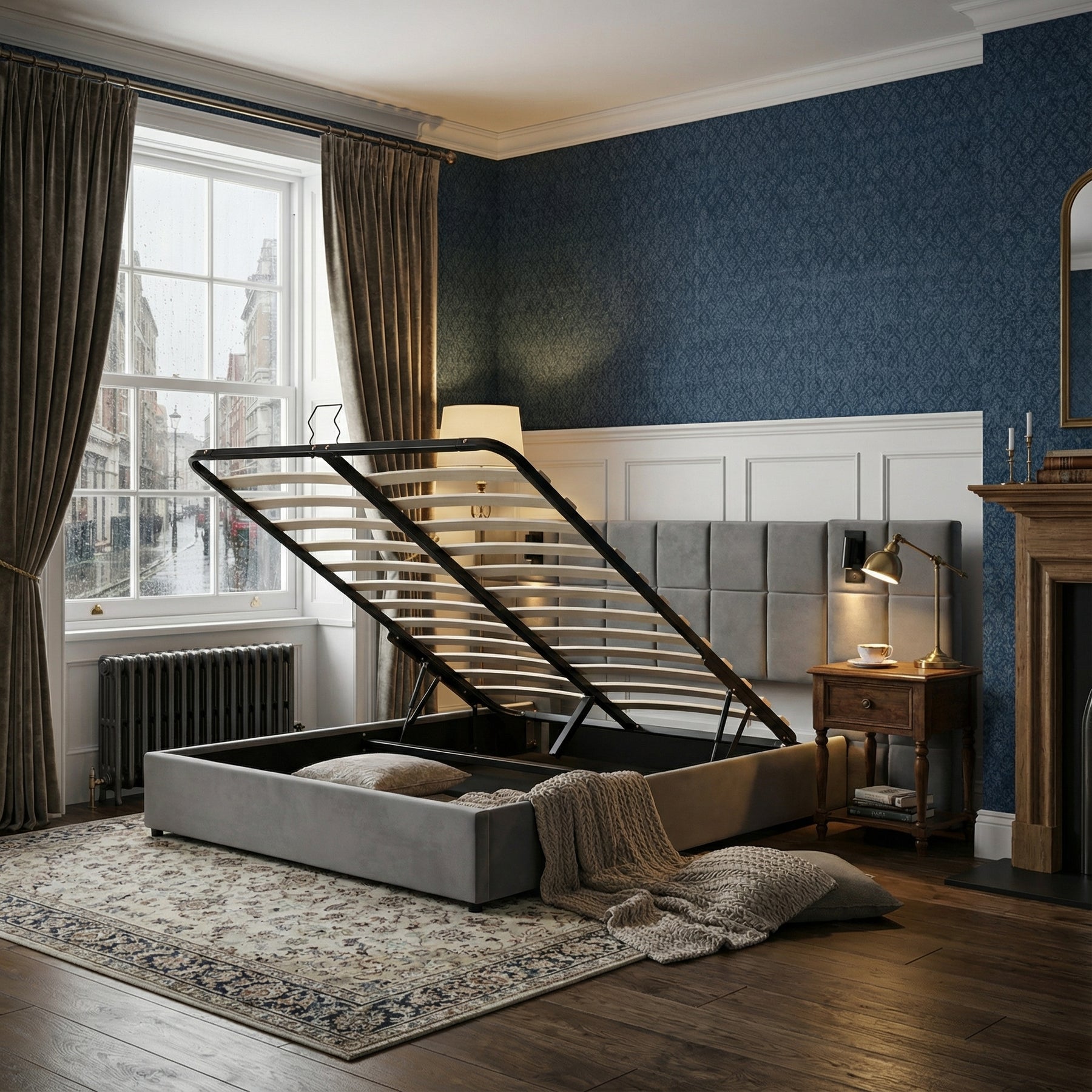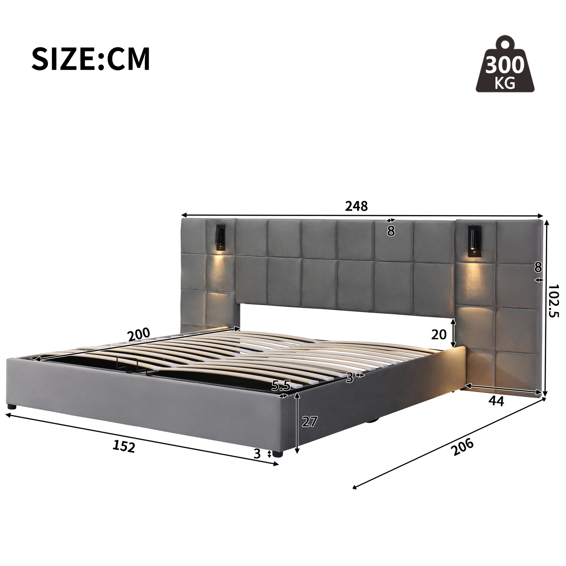 Enhance your bedroom with this modern king-size upholstered bed designed for comfort, practicality and elegant style. Featuring a wide foam-padded headboard with a bold chequered pattern, the bed creates a luxurious focal point while offering a comfortable surface for reading or relaxing. The built-in directional reading lamp and USB charging port bring modern convenience directly to your bedside, allowing easy nighttime reading and device charging. Beneath the frame, a hydraulic lift system reveals spacious storage across the entire bed area—ideal for bedding, blankets and seasonal items. Constructed with a steel frame and composite panels, the bed supports up to 300 kg and ensures long-lasting stability. Wrapped in soft velvet fabric, this bed adds warmth, comfort and contemporary appeal to any bedroom.