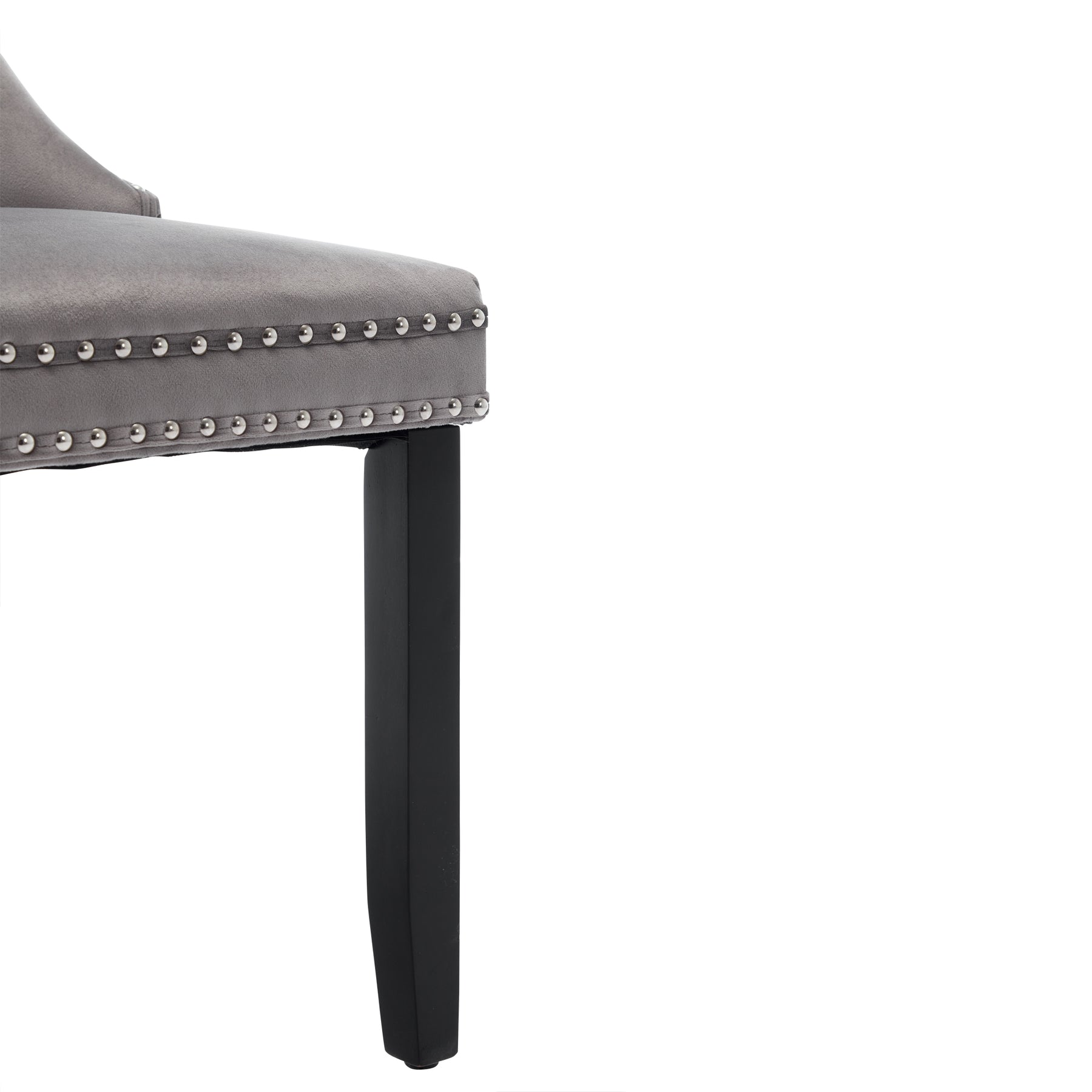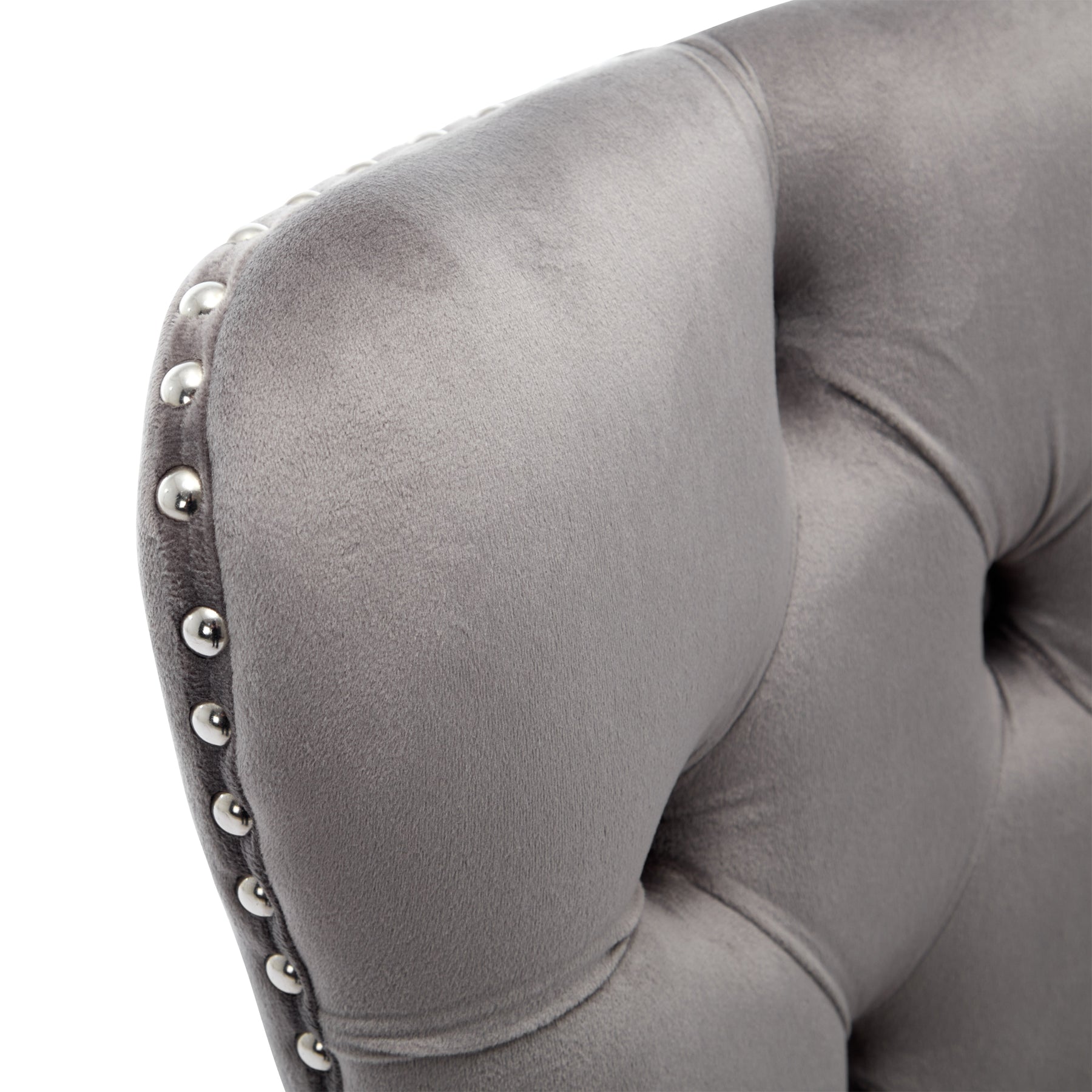 Introduce refined comfort and modern elegance into your dining or living space with this set of 4 upholstered velvet dining chairs. Featuring a sculpted wingback design with deep button tufting, decorative riveted trim and a practical knocker ring detail, these chairs blend visual sophistication with everyday comfort. Upholstered in soft grey velvet and supported by solid rubber wood legs, they offer reliable stability while enhancing a wide range of interior styles, from contemporary dining rooms to cosy lounges and reception areas.