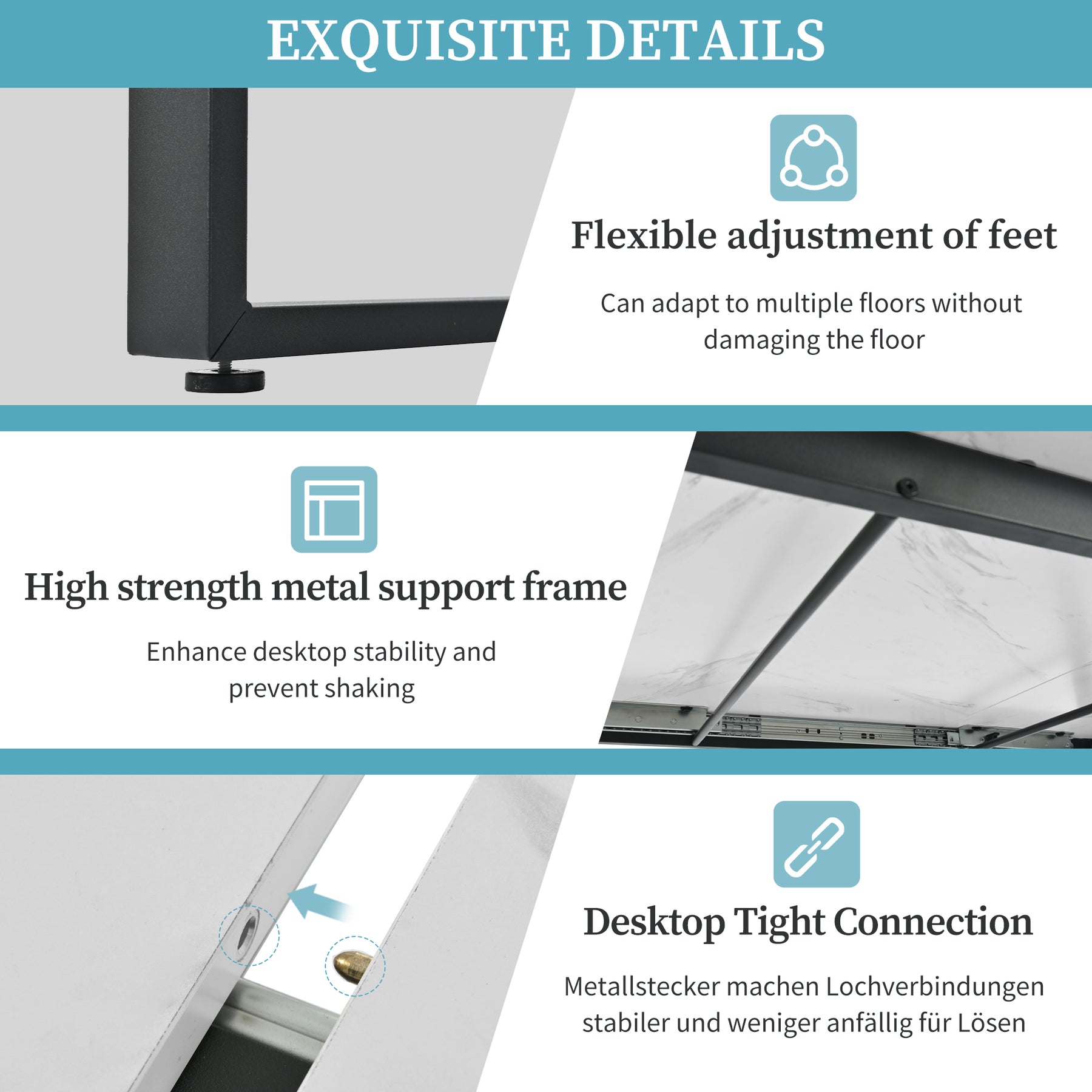 Stable and Secure Construction: The tabletop is firmly connected to the robust metal legs with a secure metal connection. This ensures high stability and prevents any wobbling or loosening, giving you peace of mind during meals and work.
