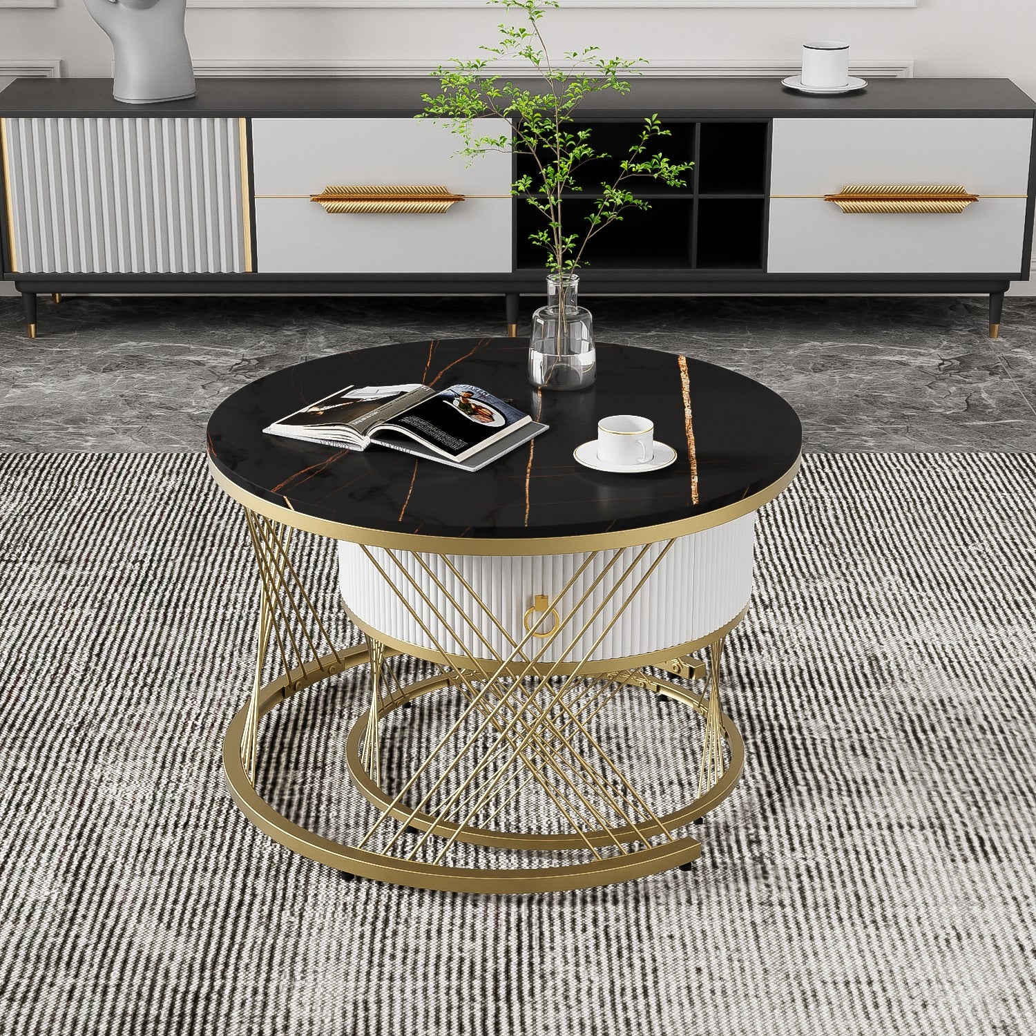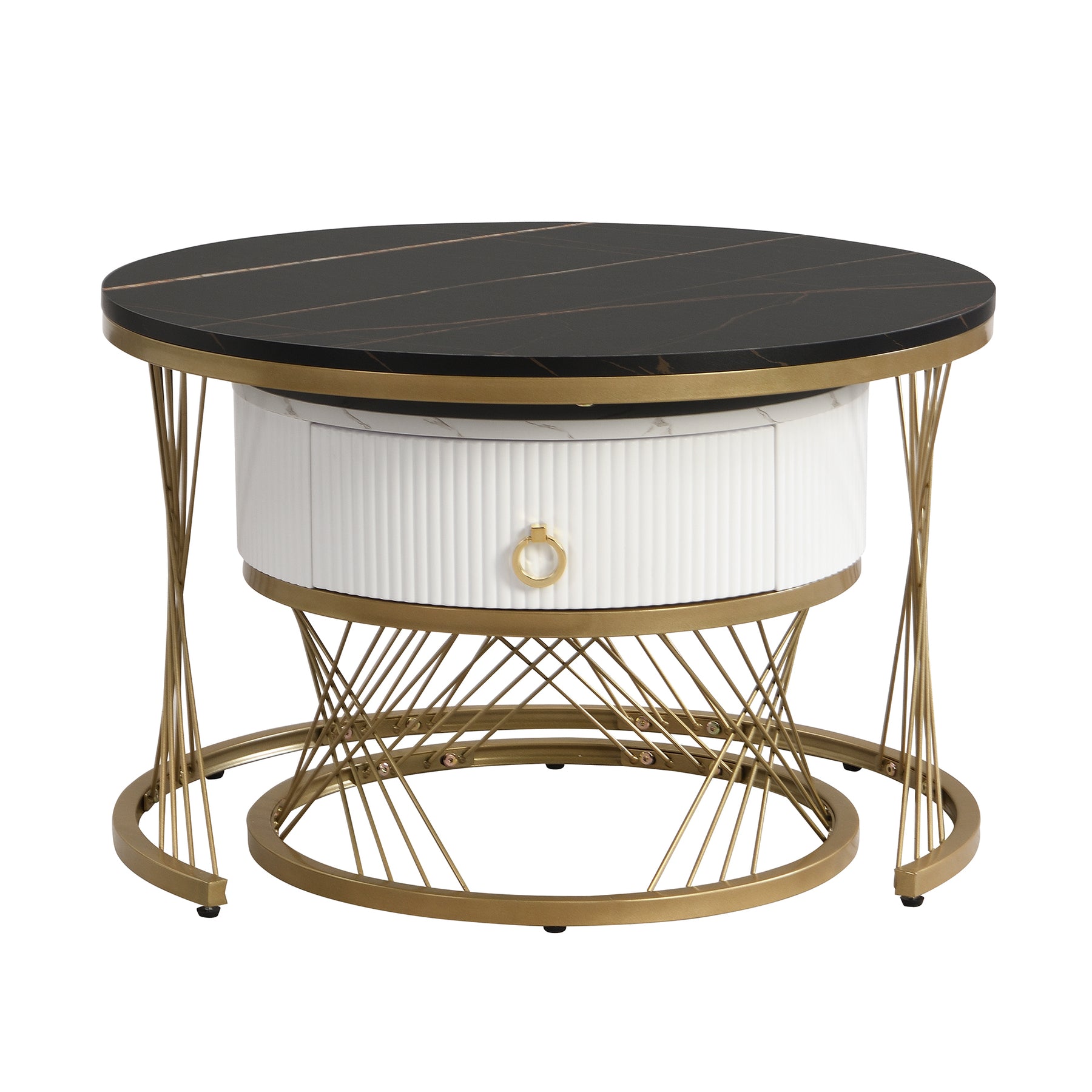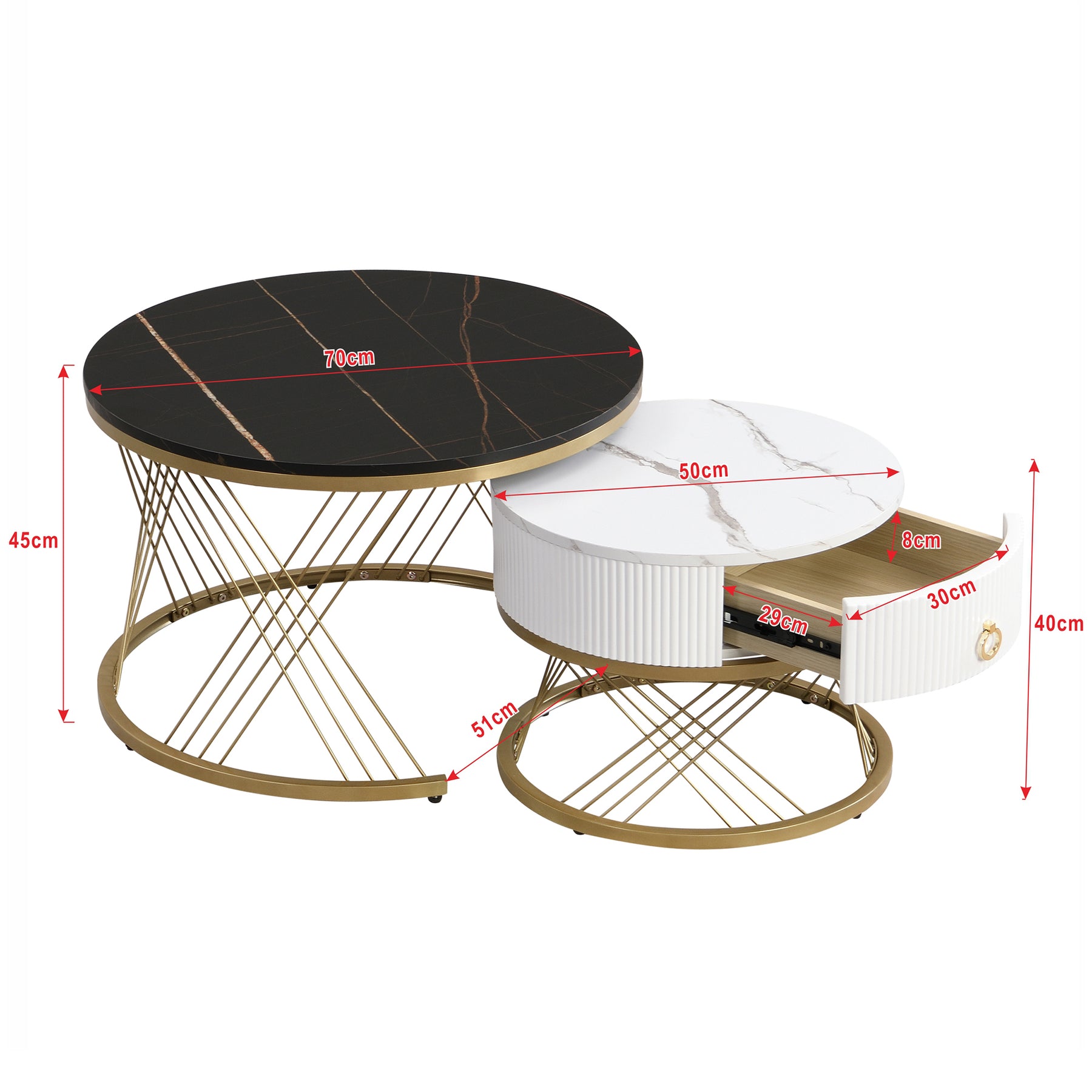 Experience the ultimate blend of sophistication and versatility with the Azkoeesy Round Marble Nesting Coffee Tables. This set features two beautifully crafted tables that can be flexibly combined or used separately, adapting to your diverse space and usage needs. The elegant marble-look tabletops, complemented by luxurious gold metal accents, bring a timeless and charming aesthetic to any living area. The smaller table offers practical storage with a high-quality drawer, making this set both a visual highlight and a functional addition to your home.
