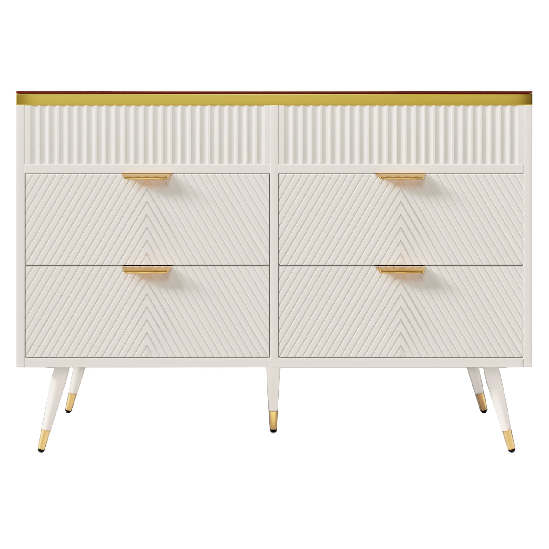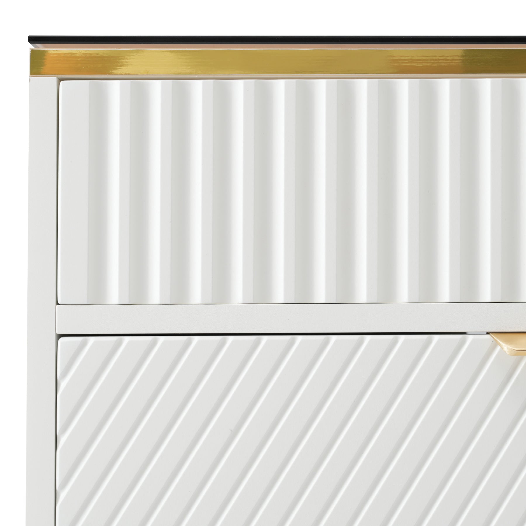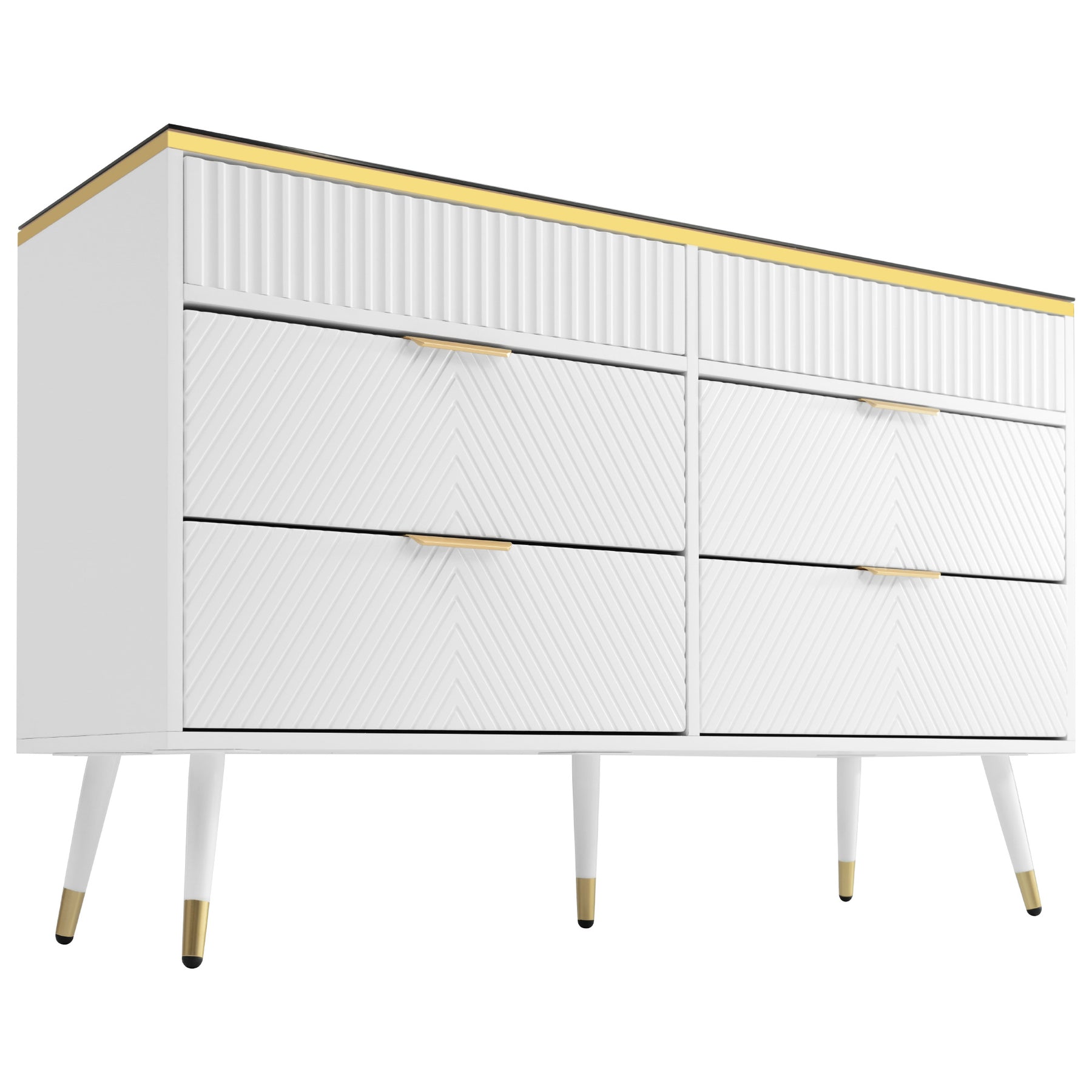 Elevate your living space with this stylish white storage cabinet, blending modern design elements with exceptional functionality. Featuring elegant brown glass accents, unique three-dimensional drawer patterns, and a brushed metal trim, this cabinet offers organized storage across six drawers, including two convenient push-to-open top drawers with dividers. Built from durable materials with a high ground clearance for easy cleaning and equipped with an anti-tip device, it's a safe and sophisticated addition to any home.
