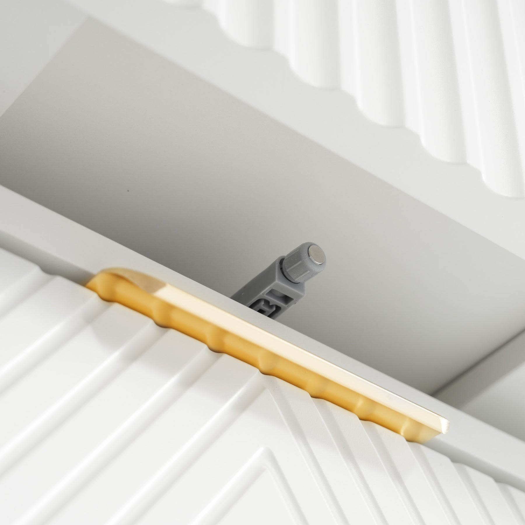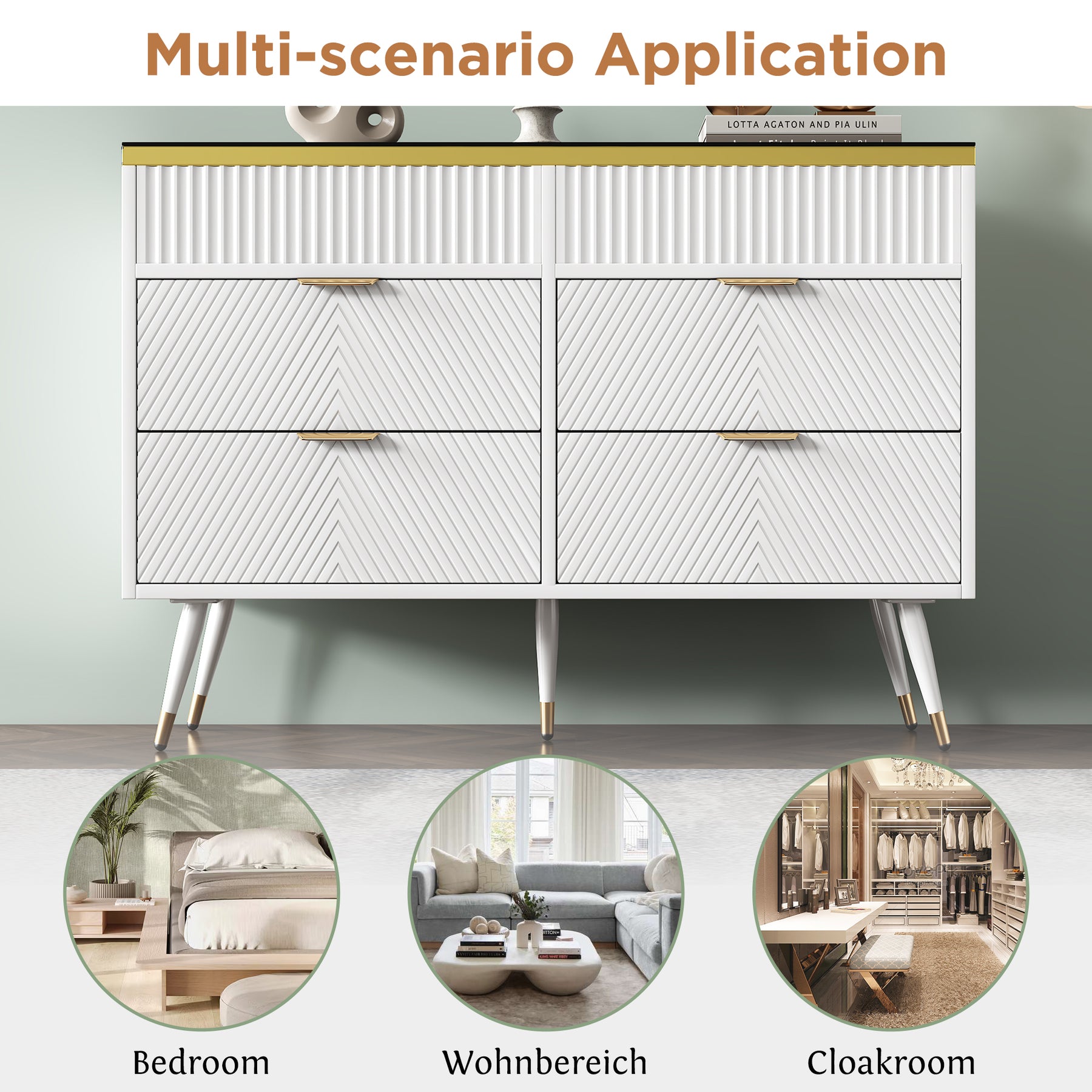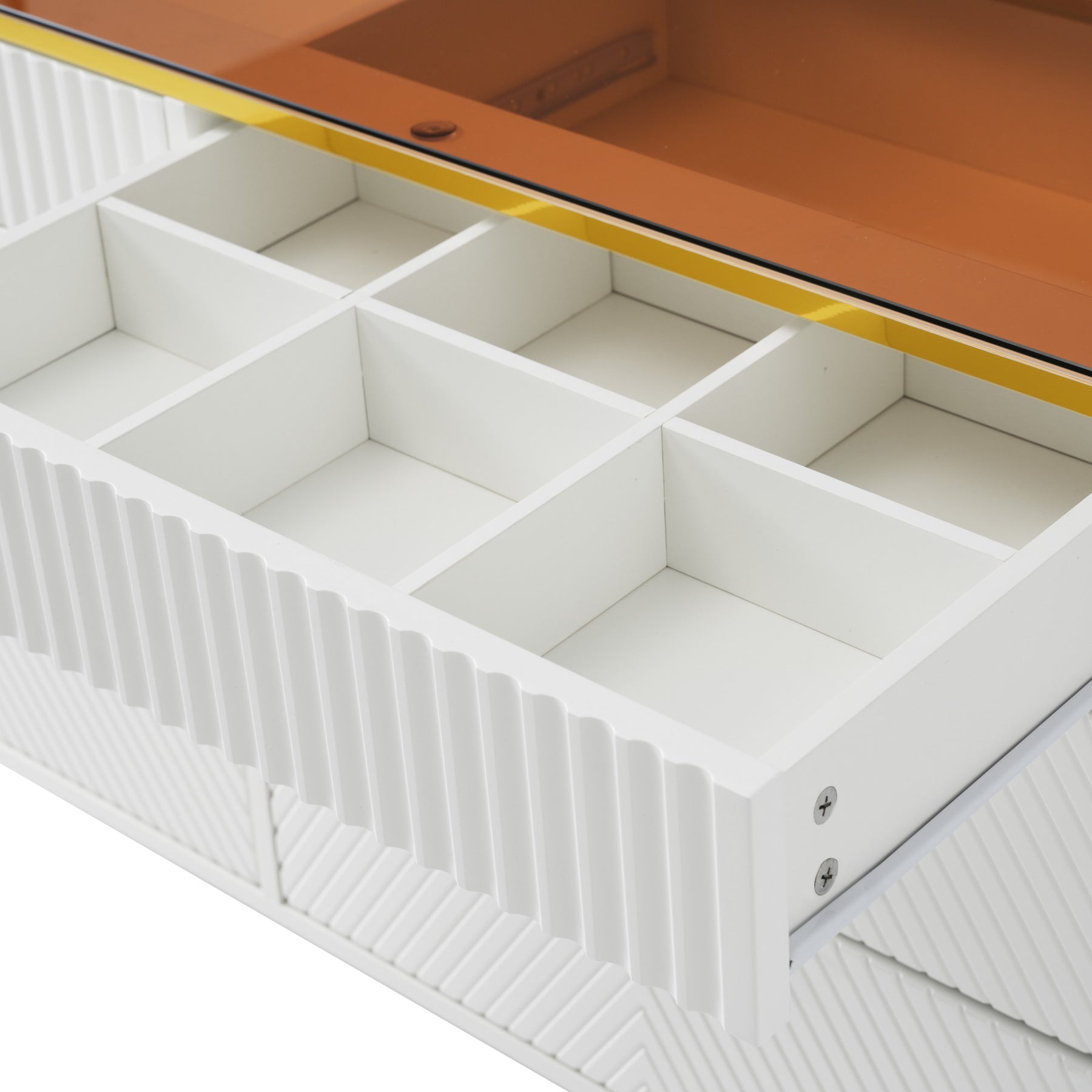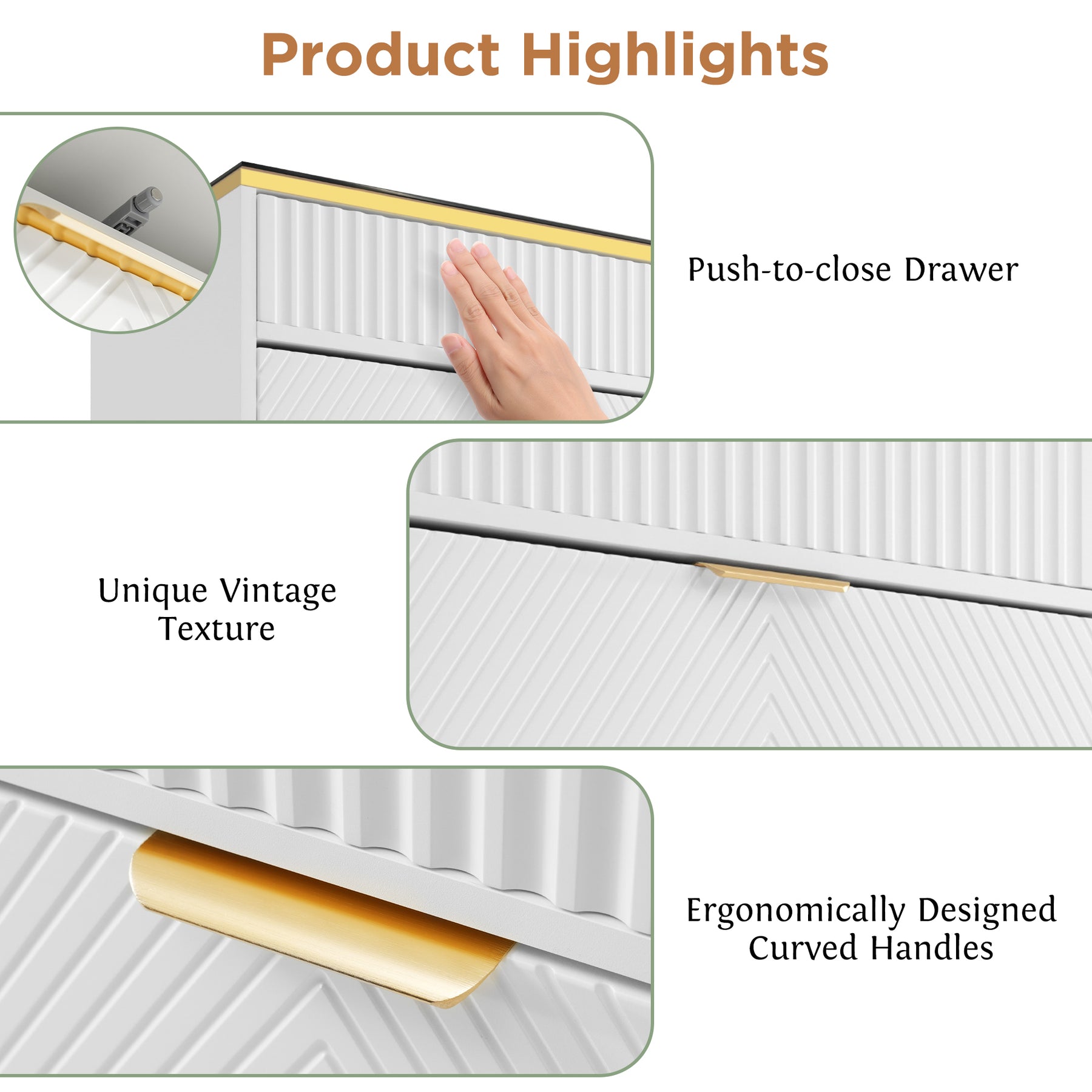 Elevate your living space with this stylish white storage cabinet, blending modern design elements with exceptional functionality. Featuring elegant brown glass accents, unique three-dimensional drawer patterns, and a brushed metal trim, this cabinet offers organized storage across six drawers, including two convenient push-to-open top drawers with dividers. Built from durable materials with a high ground clearance for easy cleaning and equipped with an anti-tip device, it's a safe and sophisticated addition to any home.