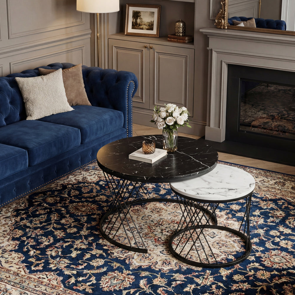 Set of 2 white and black marble pattern nesting coffee tables SCROVROK UK