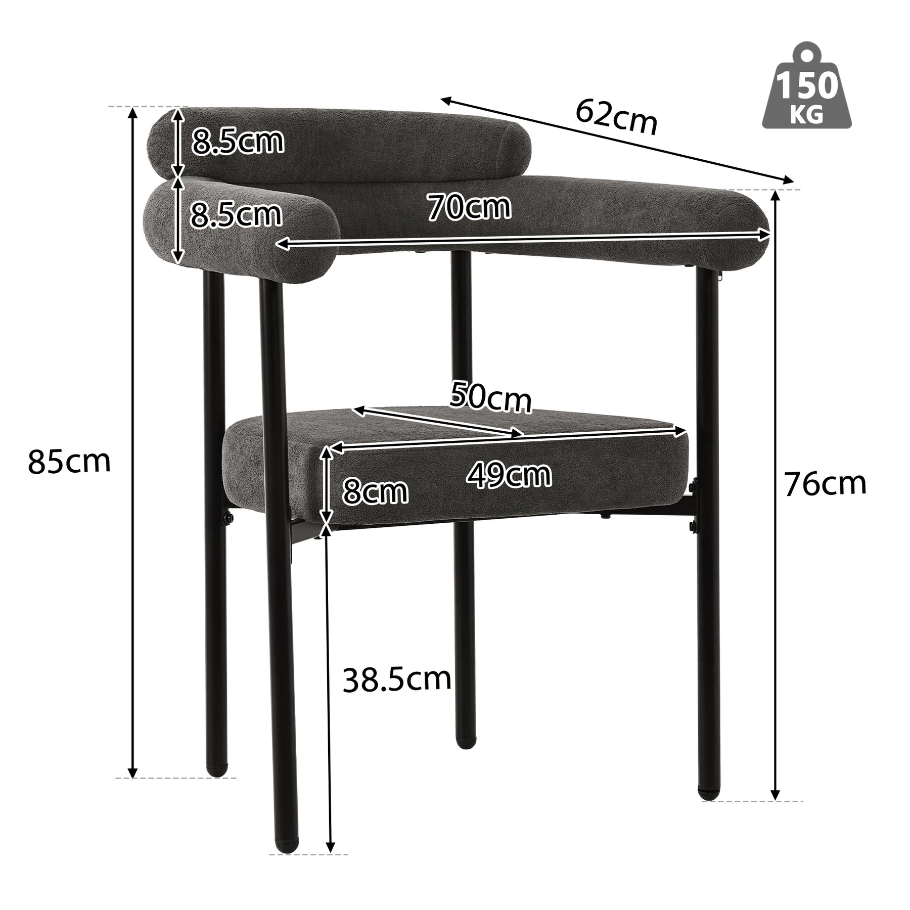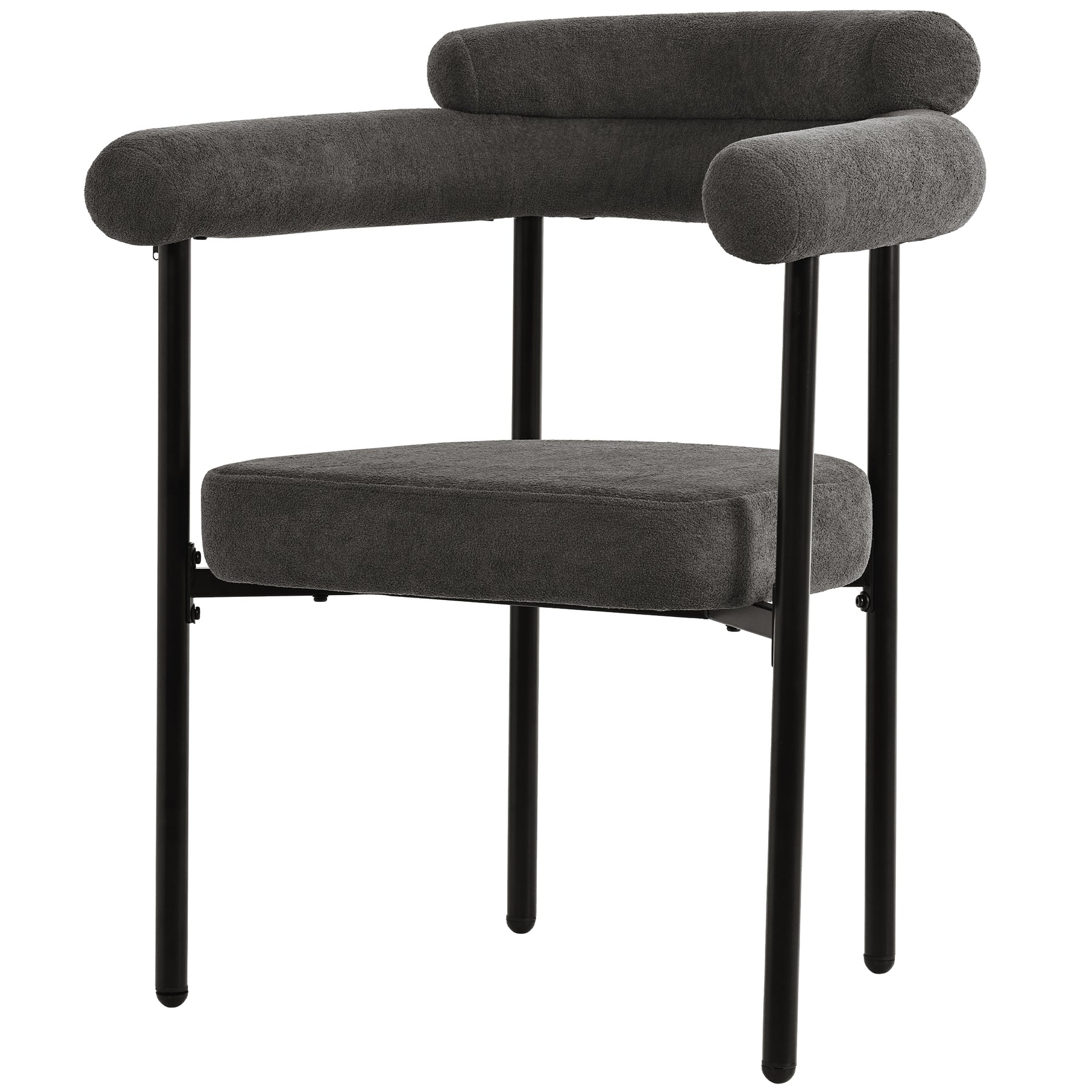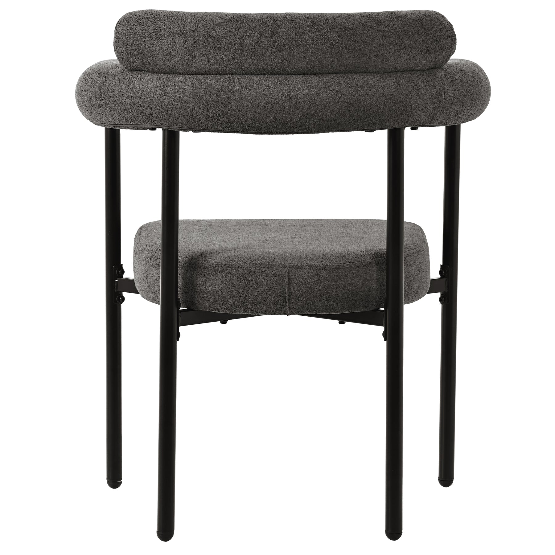 Experience the perfect blend of comfort and contemporary style with this set of two modern armchairs. Upholstered in a soft gray fabric with a luxurious feel, these chairs feature a unique rounded arm and backrest design supported by a sleek black metal frame. Their ergonomic construction and high-density foam padding provide exceptional comfort and support, making them an ideal addition to your dining room, living room, or study for both everyday use and sophisticated appeal.
