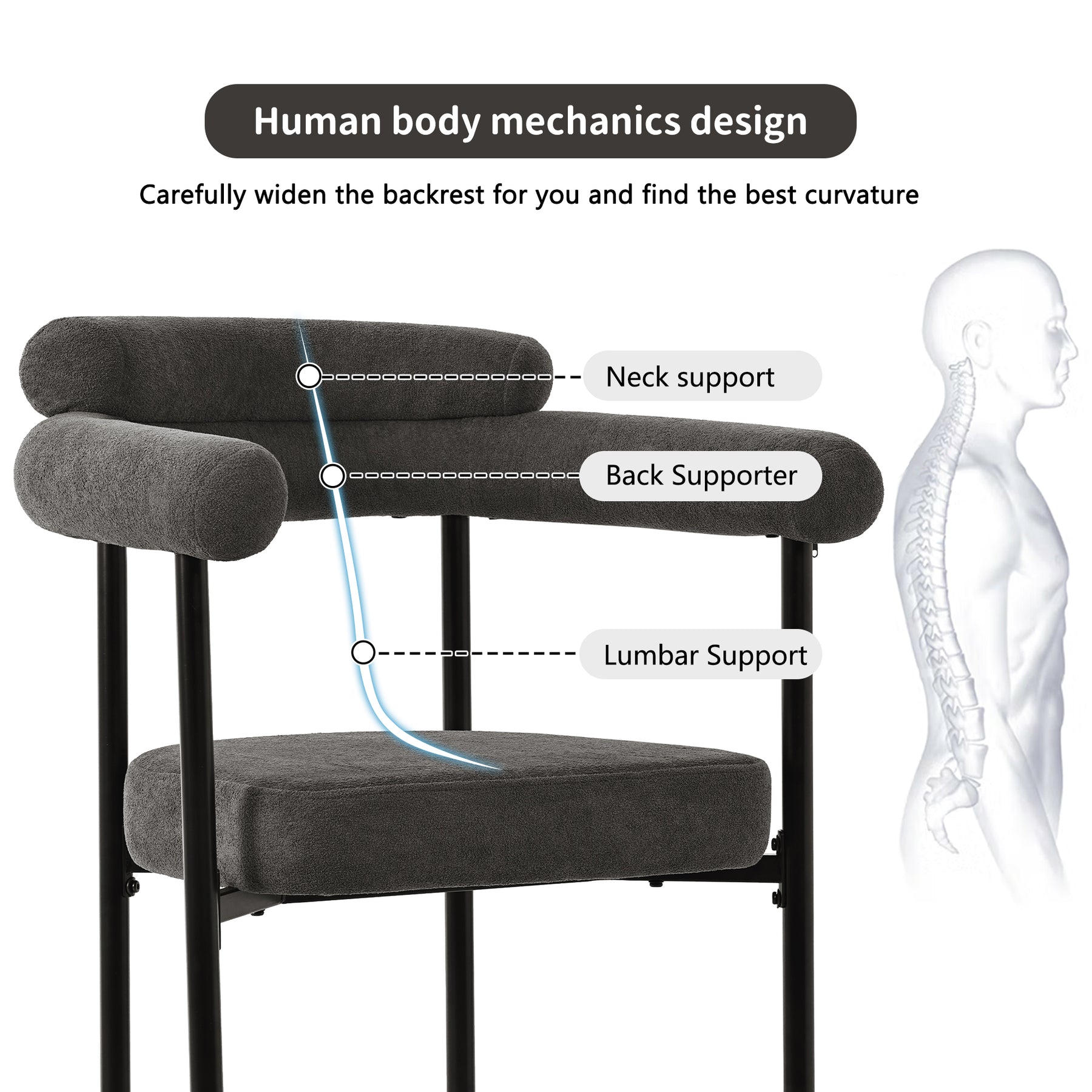 Ergonomic Back & Arm Support: The thoughtfully designed backrest conforms to the natural curve of the body, offering excellent lumbar and back support, while the unique rounded arms provide comfortable resting points, promoting healthy posture.