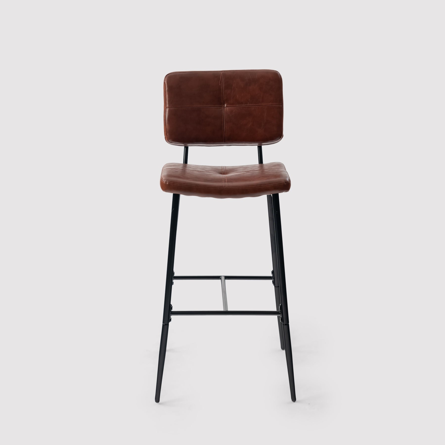 Add a touch of vintage industrial charm and robust elegance to your space with this set of two fixed-height bar stools. Featuring a rich brown oiled leather coating with a durable PVC finish and sleek black metal legs, these stools are designed for both comfort and versatile style. Perfect for your home bar, kitchen, or café, their ergonomic design and integrated footrest ensure a comfortable and engaging seating experience for all your relaxing or dining moments.