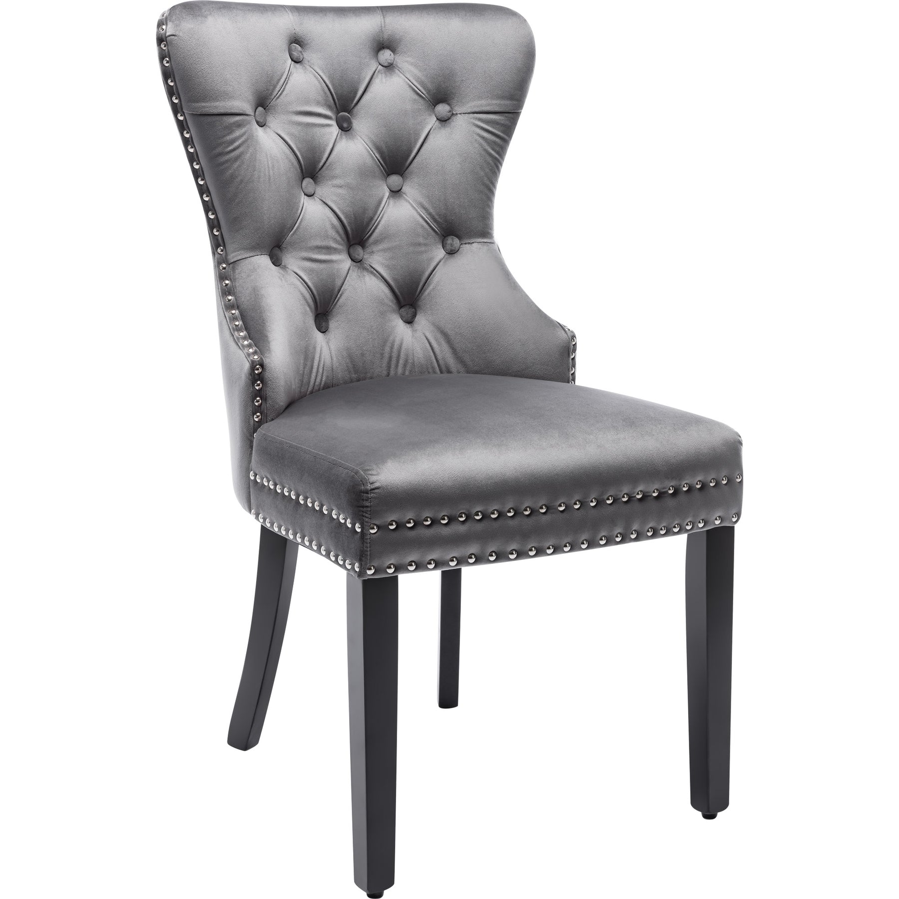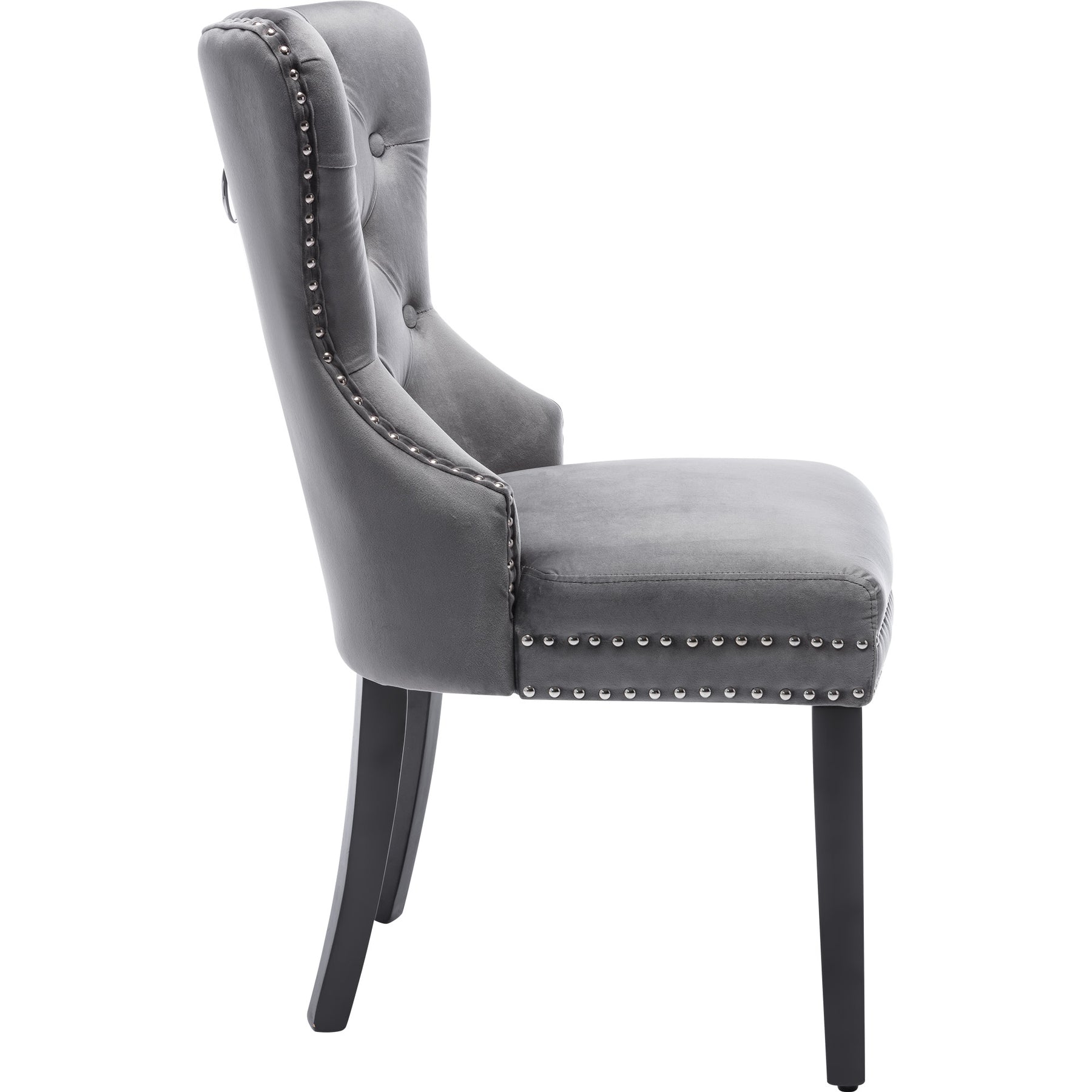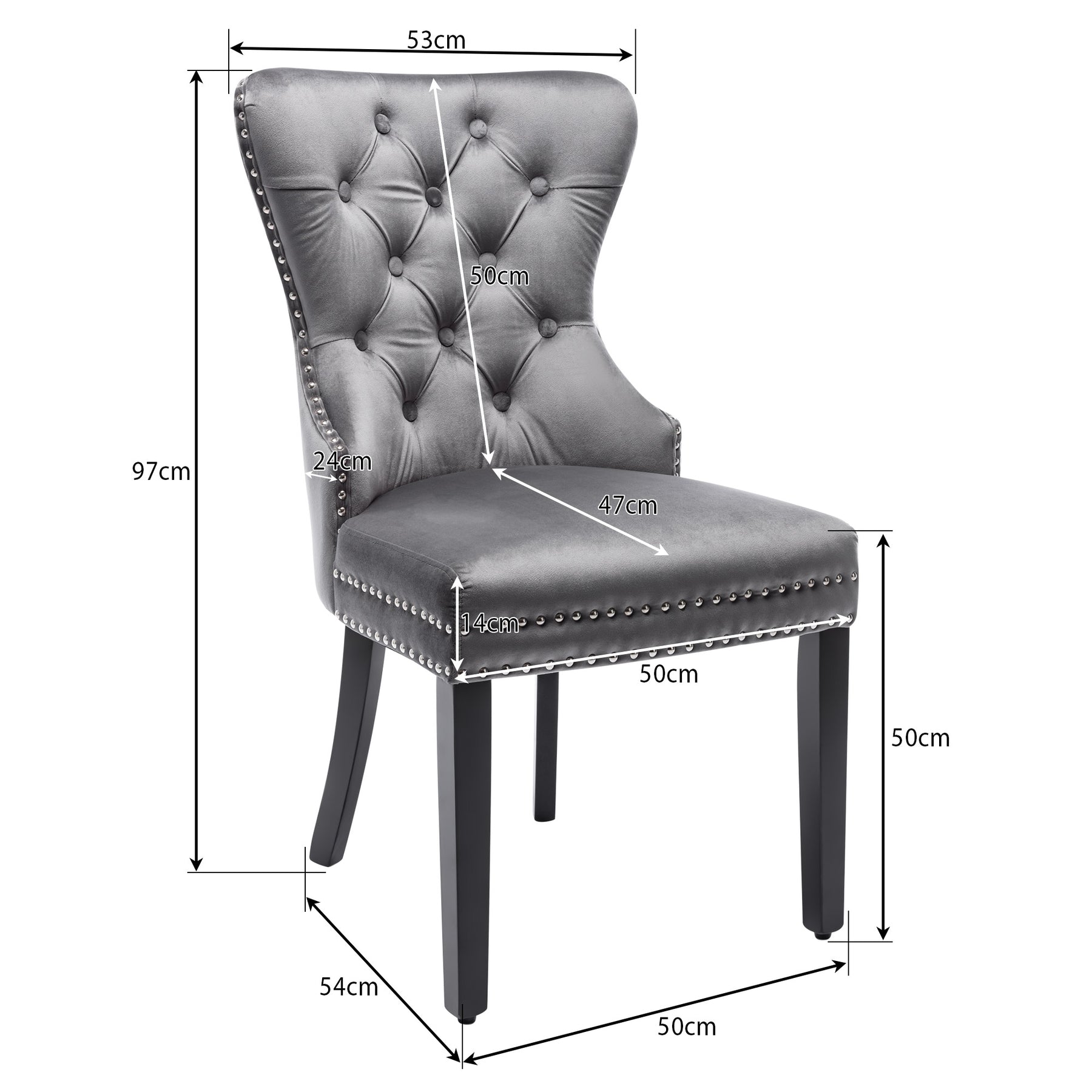 Bring timeless elegance and superior comfort to your dining or living space with this 6-piece velvet dining chair set. Upholstered in soft, stain-resistant velvet, each chair combines classic craftsmanship with modern sophistication. The tufted backrest, chrome ring handle, and nailhead trim add refined details, while the solid oak legs ensure strength and stability. Perfect for the dining room, bedroom, or leisure lounge, these chairs offer luxurious seating that complements any interior style.