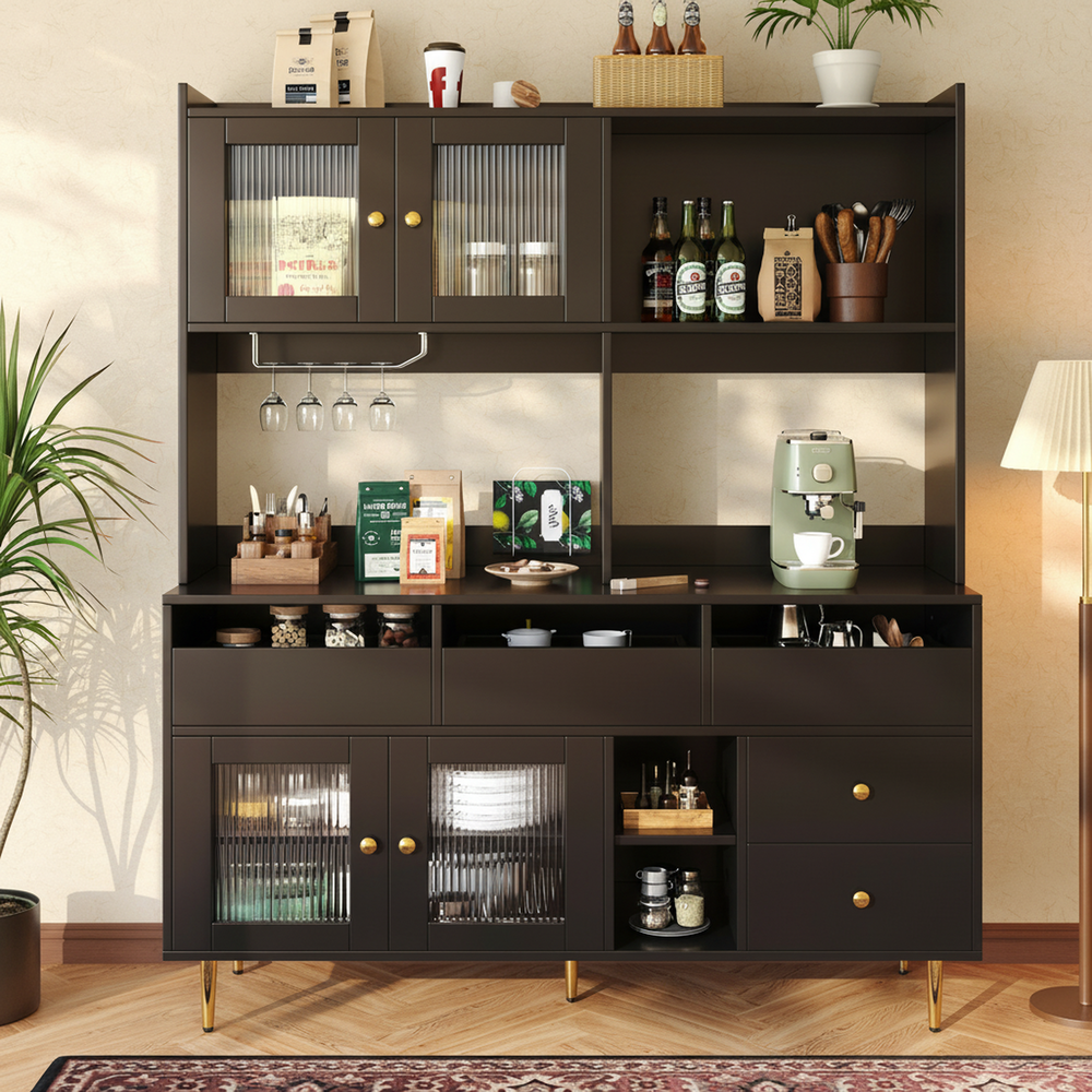 Black kitchen hutches buffet with LED lighting, fluted glass sliding doors VIGOURAN