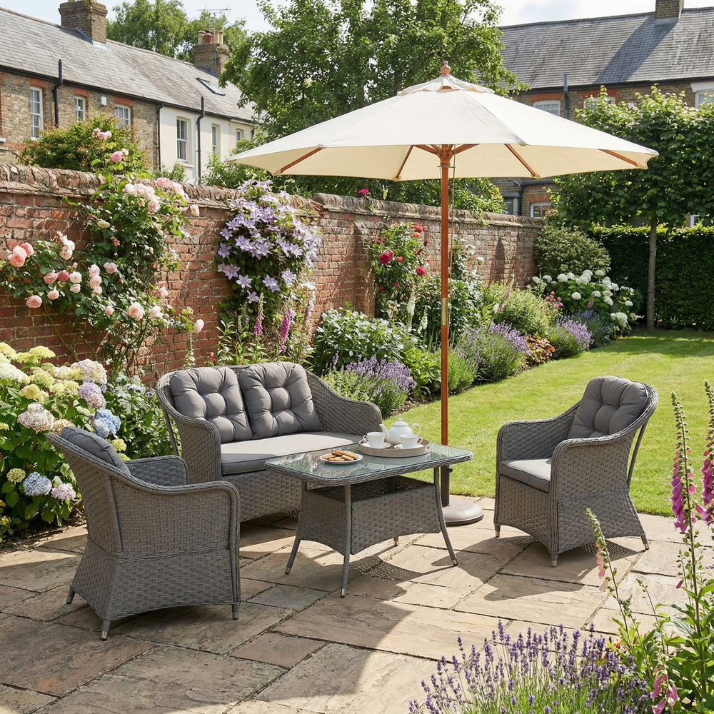 Rattan Garden Furniture Set 4 Pieces Light Grey, Glass Table, Cushions NOBLEIS