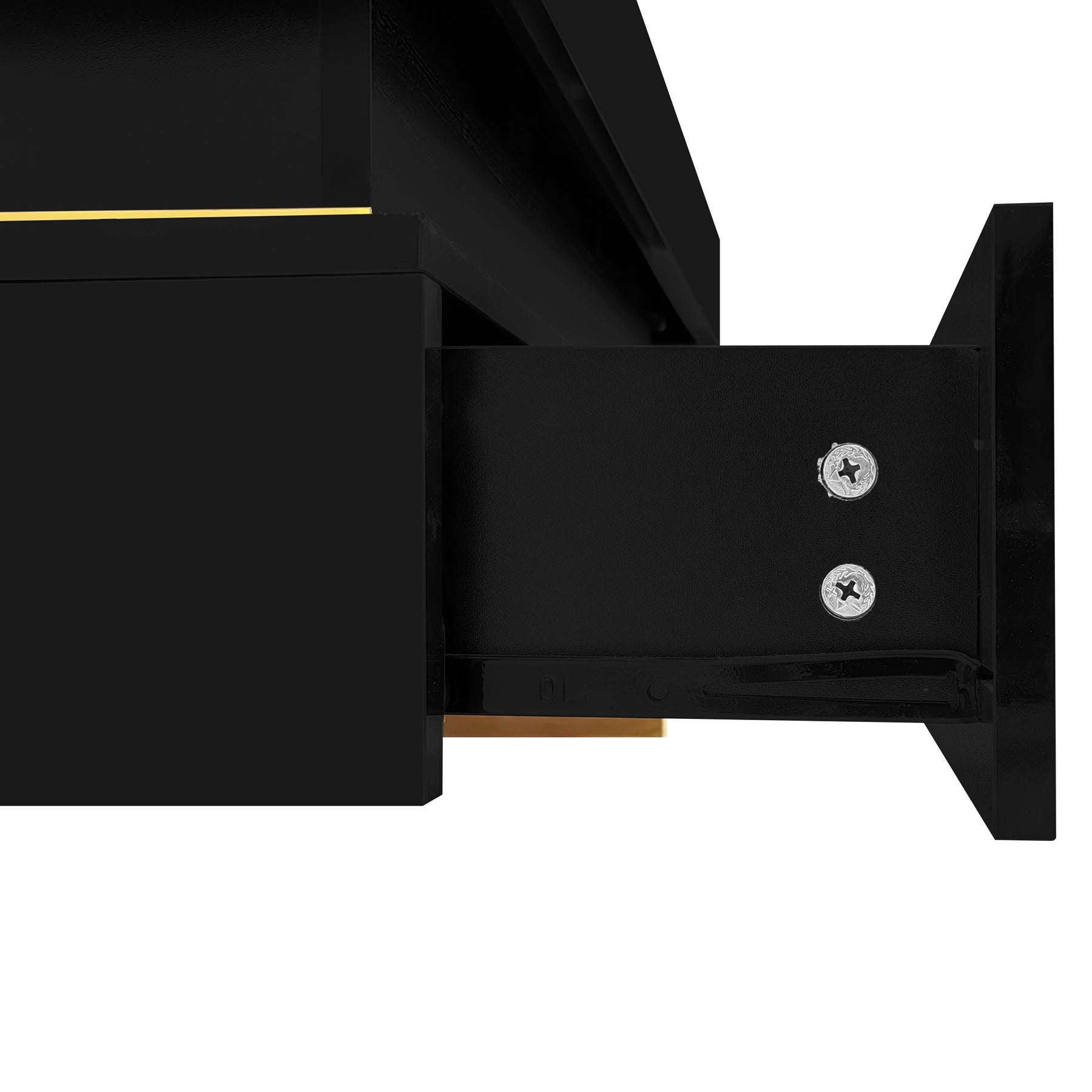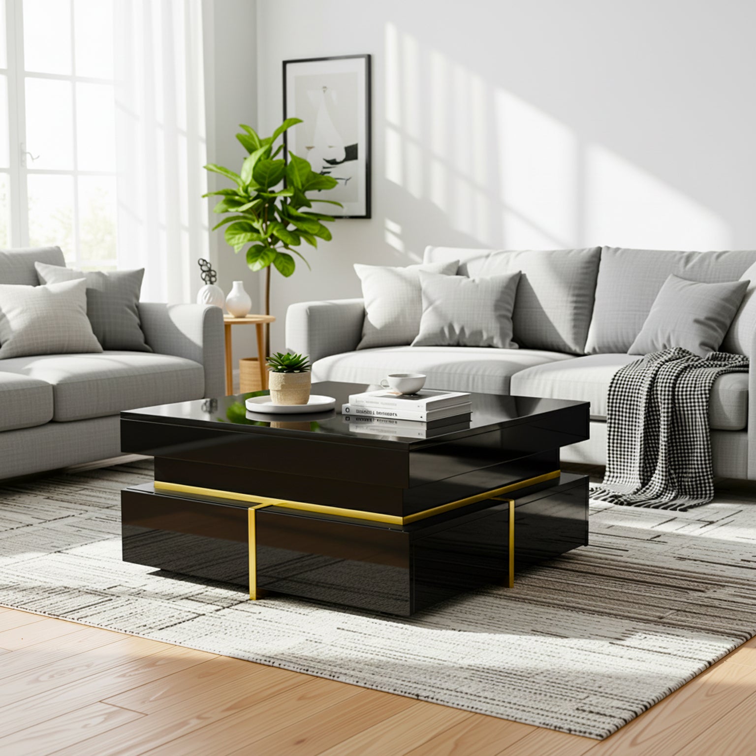 Add a touch of refined luxury to your living space with this elegant high-gloss coffee table. Its sleek black finish paired with gold accents brings a modern yet timeless aesthetic to your living room. Featuring two spacious drawers for organized storage, this table combines functionality with exquisite design. Crafted from durable particle board and high-quality hardware, it offers both stability and long-lasting use. Compact yet stylish, it fits perfectly in both large and small living spaces, serving as a sophisticated centerpiece.