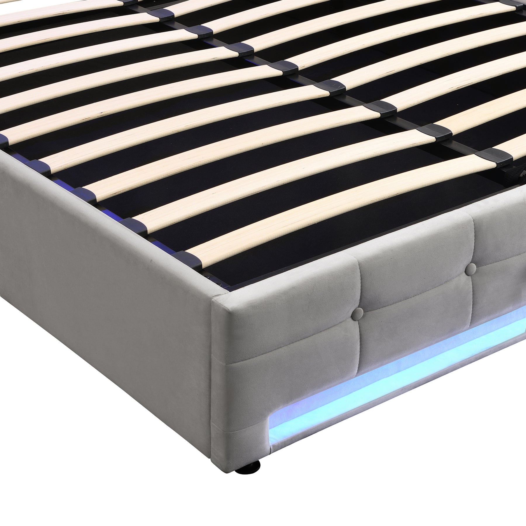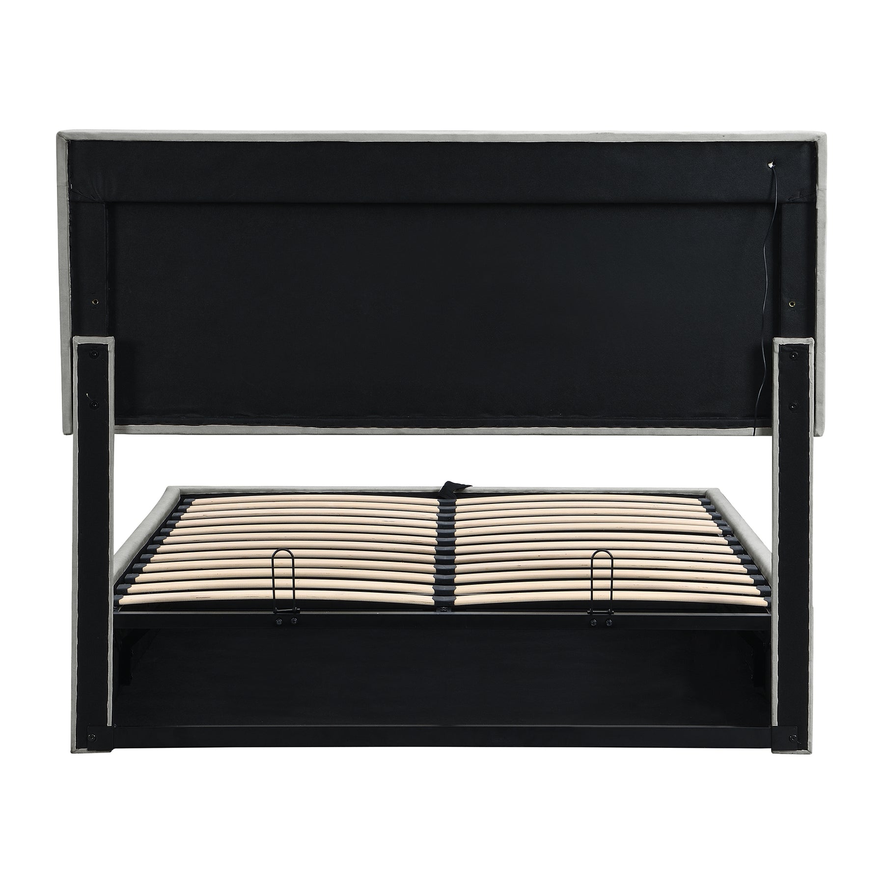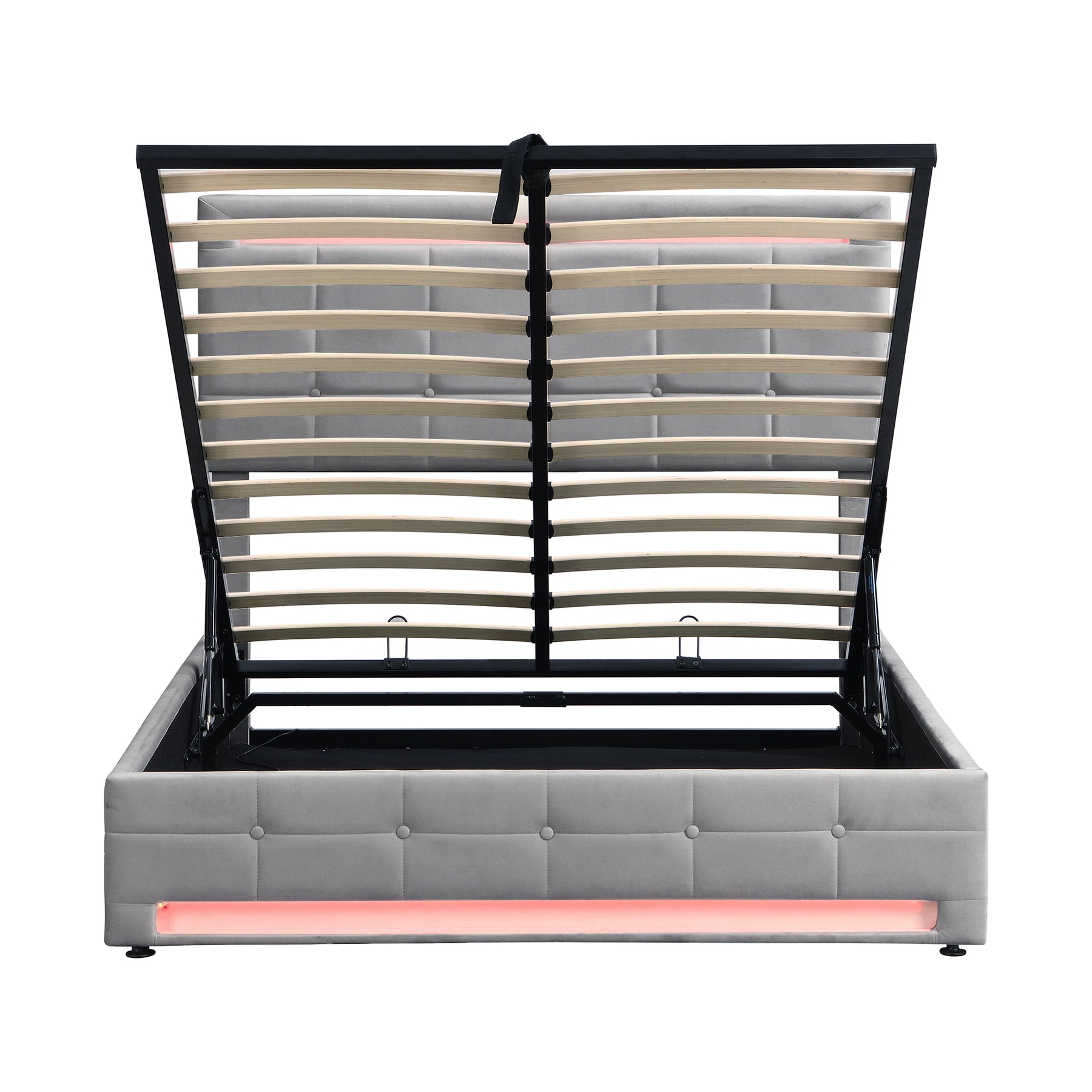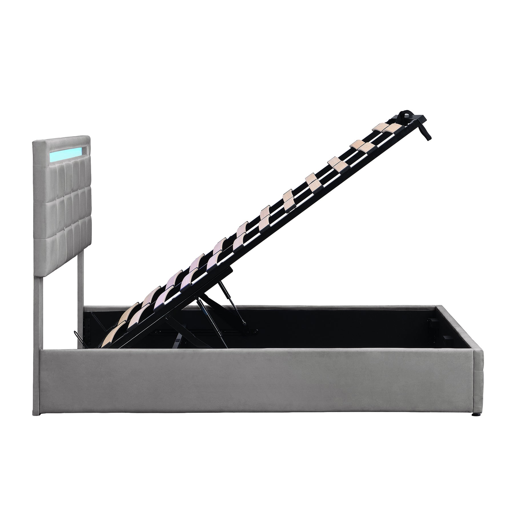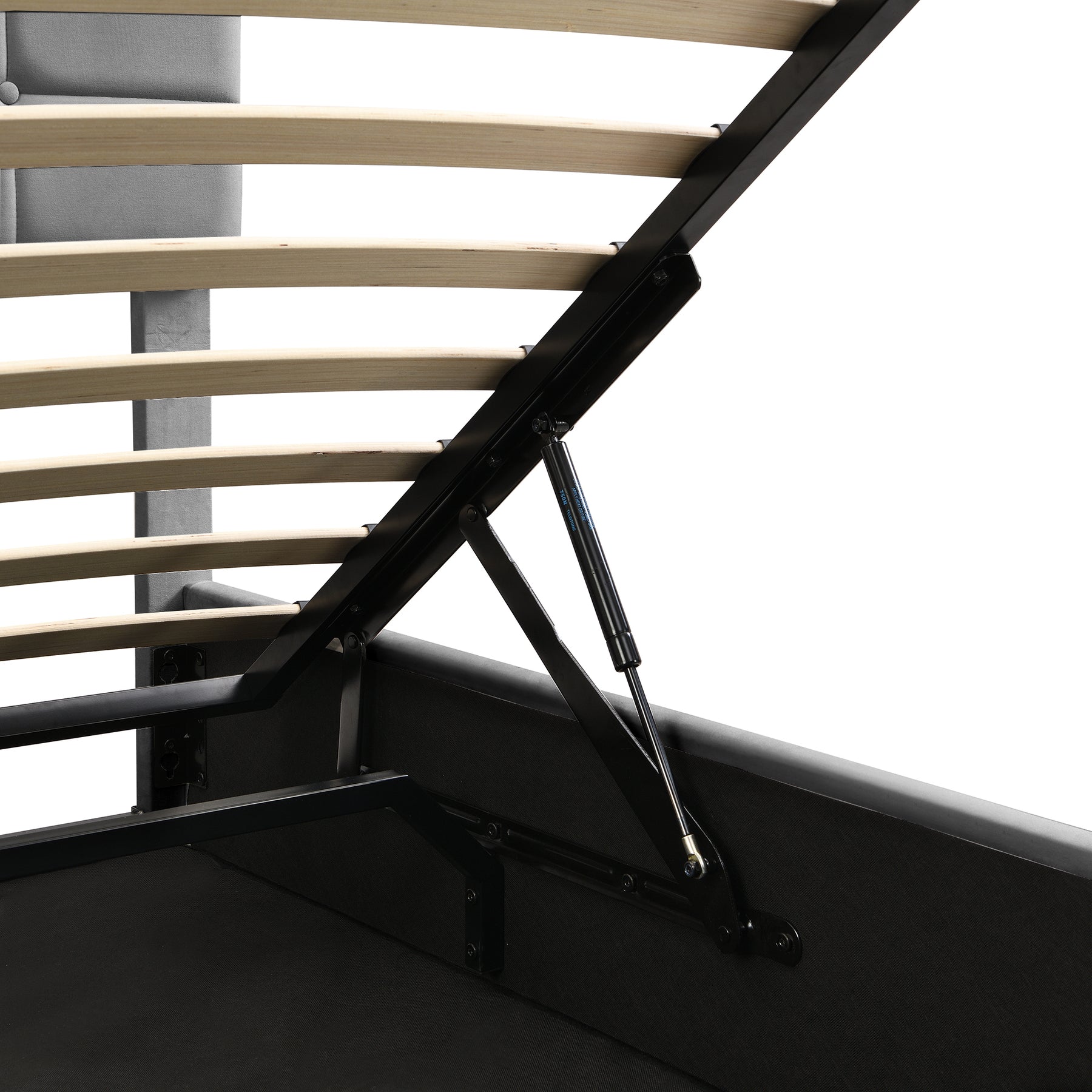 Hydraulic under-bed storage: premium lift mechanism reveals ample hidden storage space ideal for bedding, blankets, clothing or seasonal items.