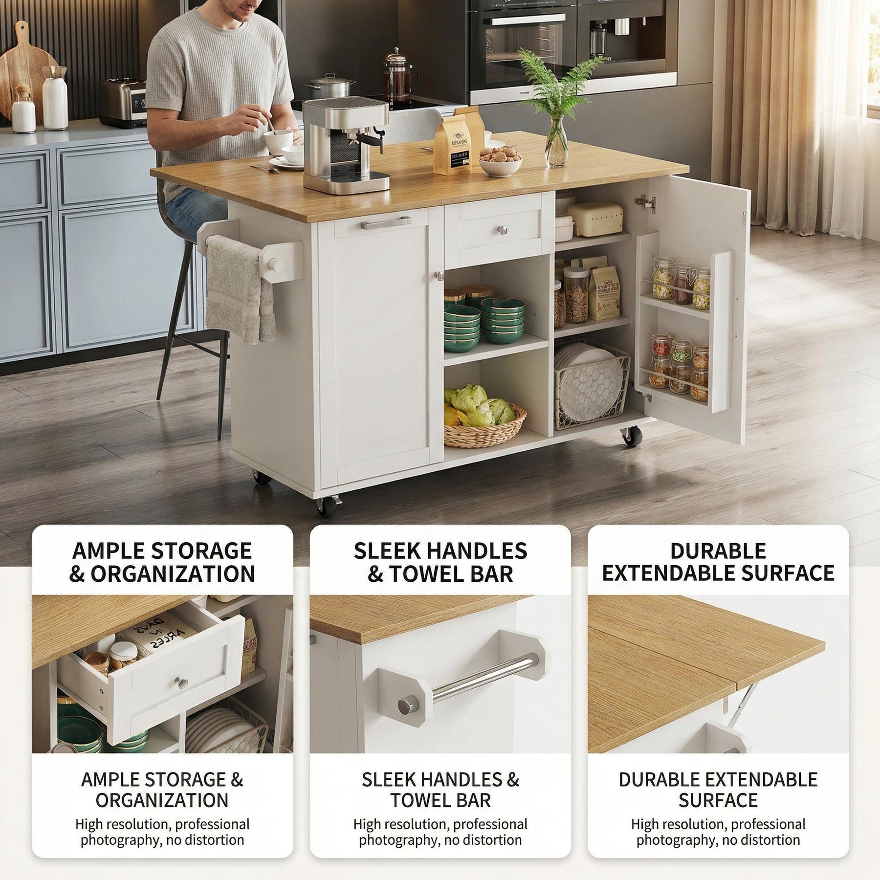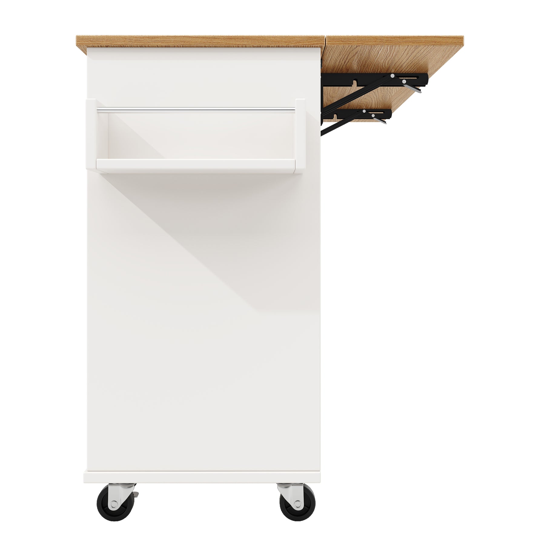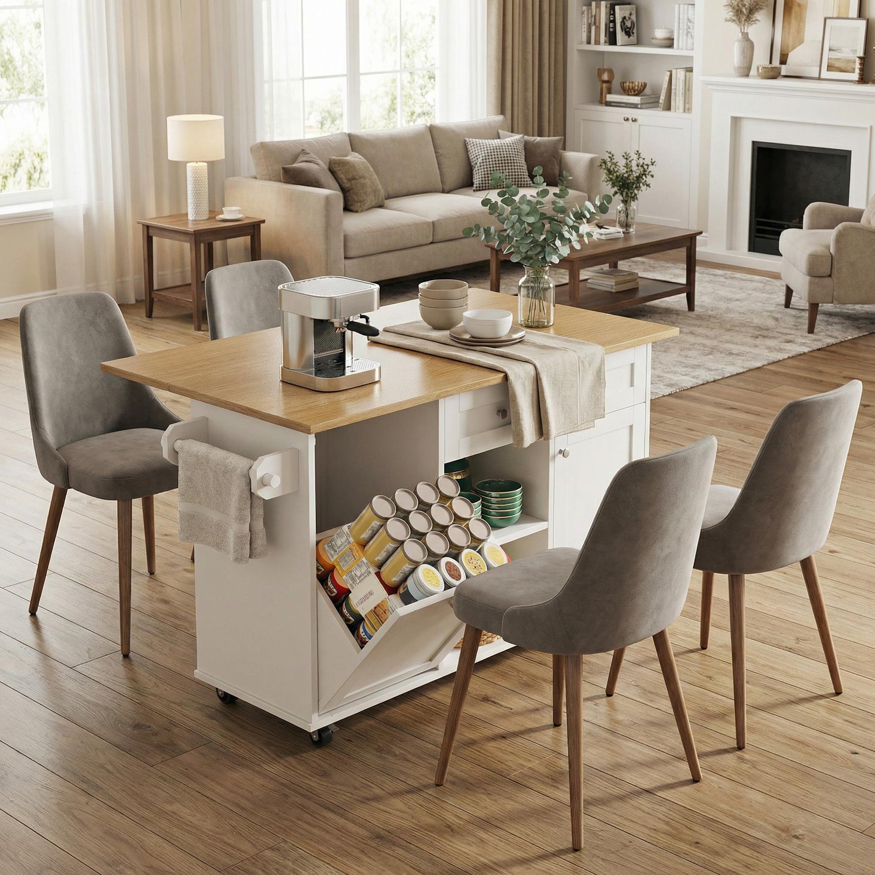 Upgrade your home with this modern multifunctional kitchen island, designed to combine storage, flexibility and everyday practicality in one elegant unit. Finished in clean white, this serving trolley features an extendable tabletop, folding cabinet doors and integrated snack shelves, making it a versatile solution for kitchens, dining areas, living rooms or home offices. Thoughtful details and a smart mobility system allow it to adapt effortlessly to different spaces and daily needs.