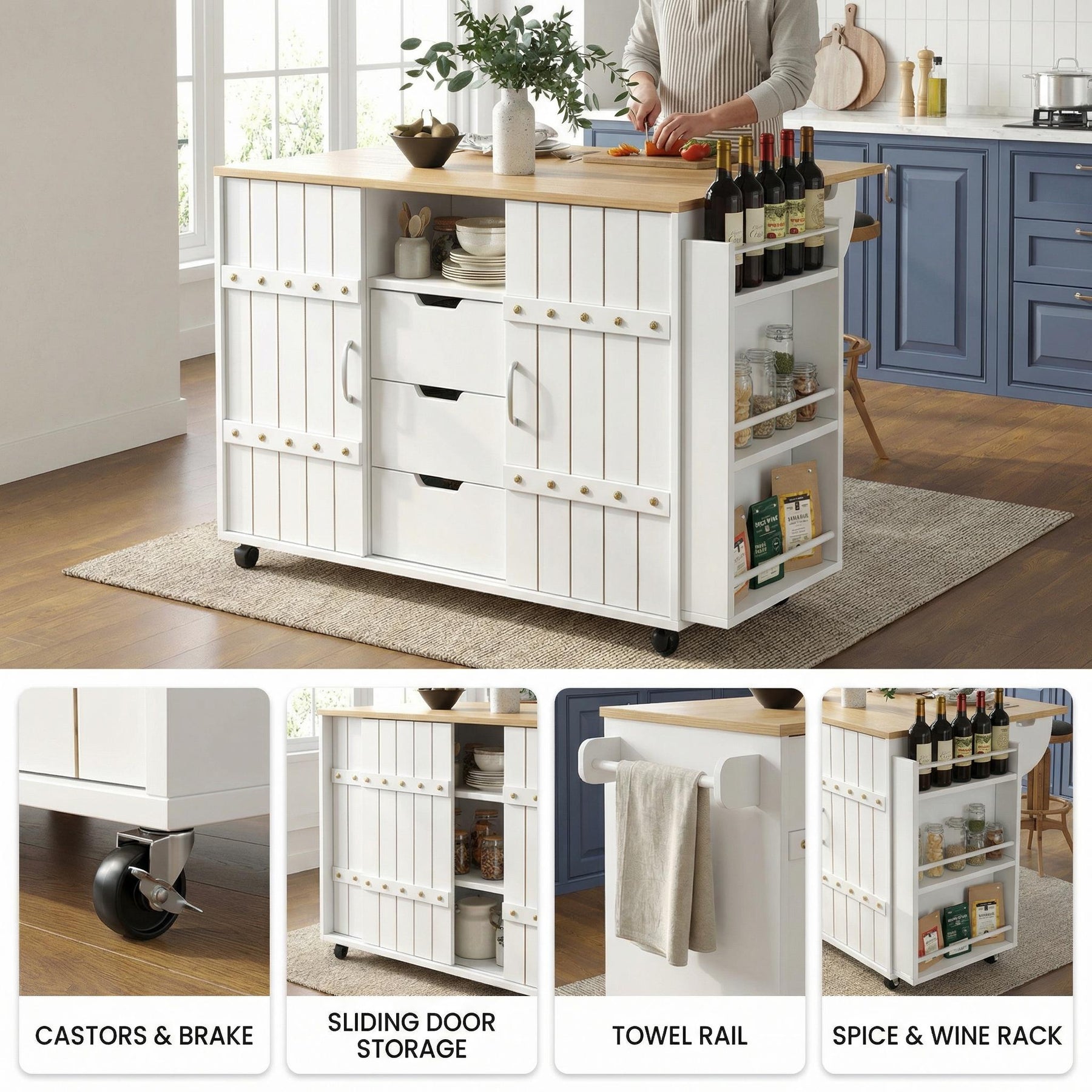 Add flexibility and smart storage to your kitchen with this modern serving trolley designed for everyday efficiency. Finished in clean white with a wood grain worktop, this kitchen island combines drawers, sliding-door storage and practical accessories in a compact footprint. The fold-out tabletop, integrated spice rack and towel rail make it a versatile solution for food preparation, dining and organisation in modern homes.