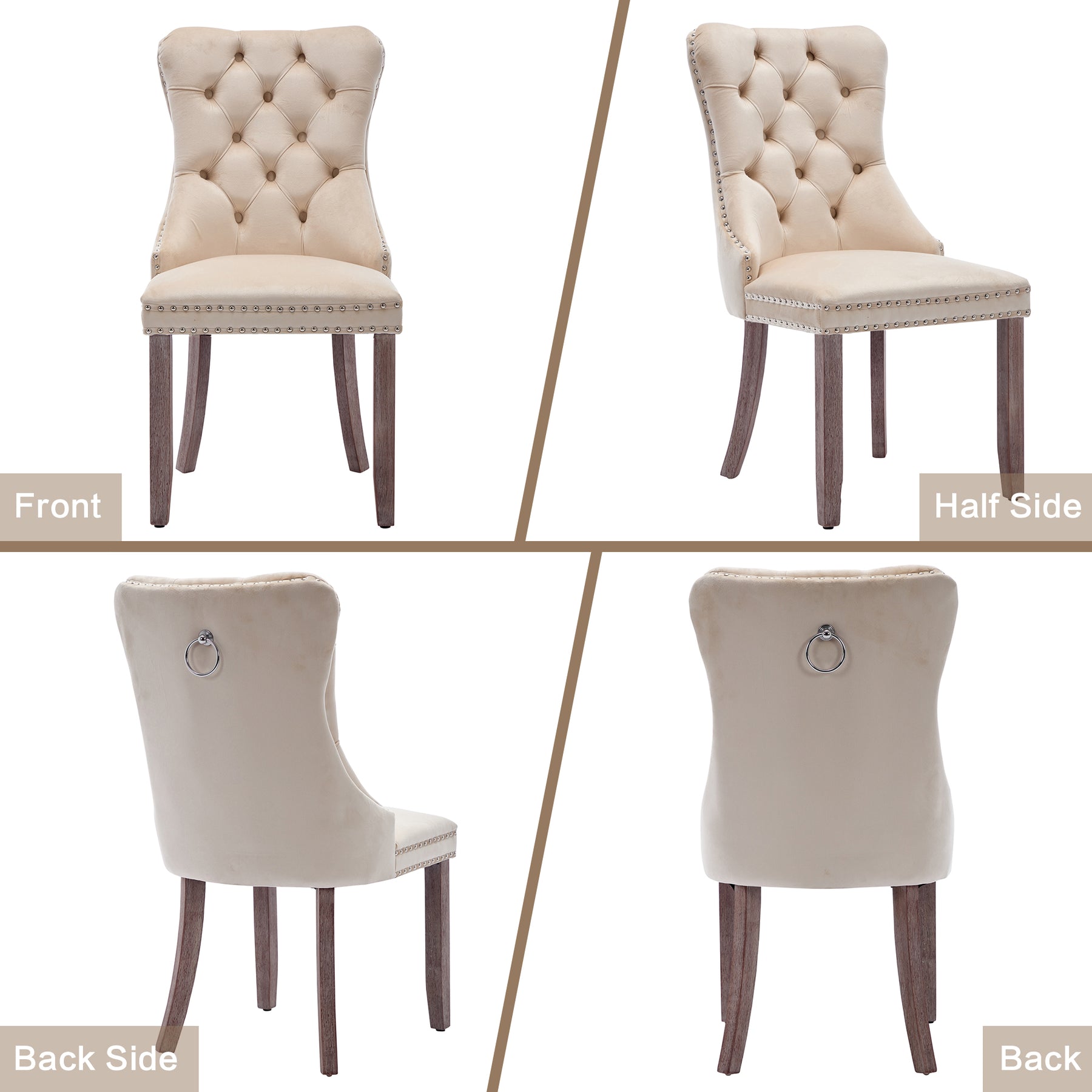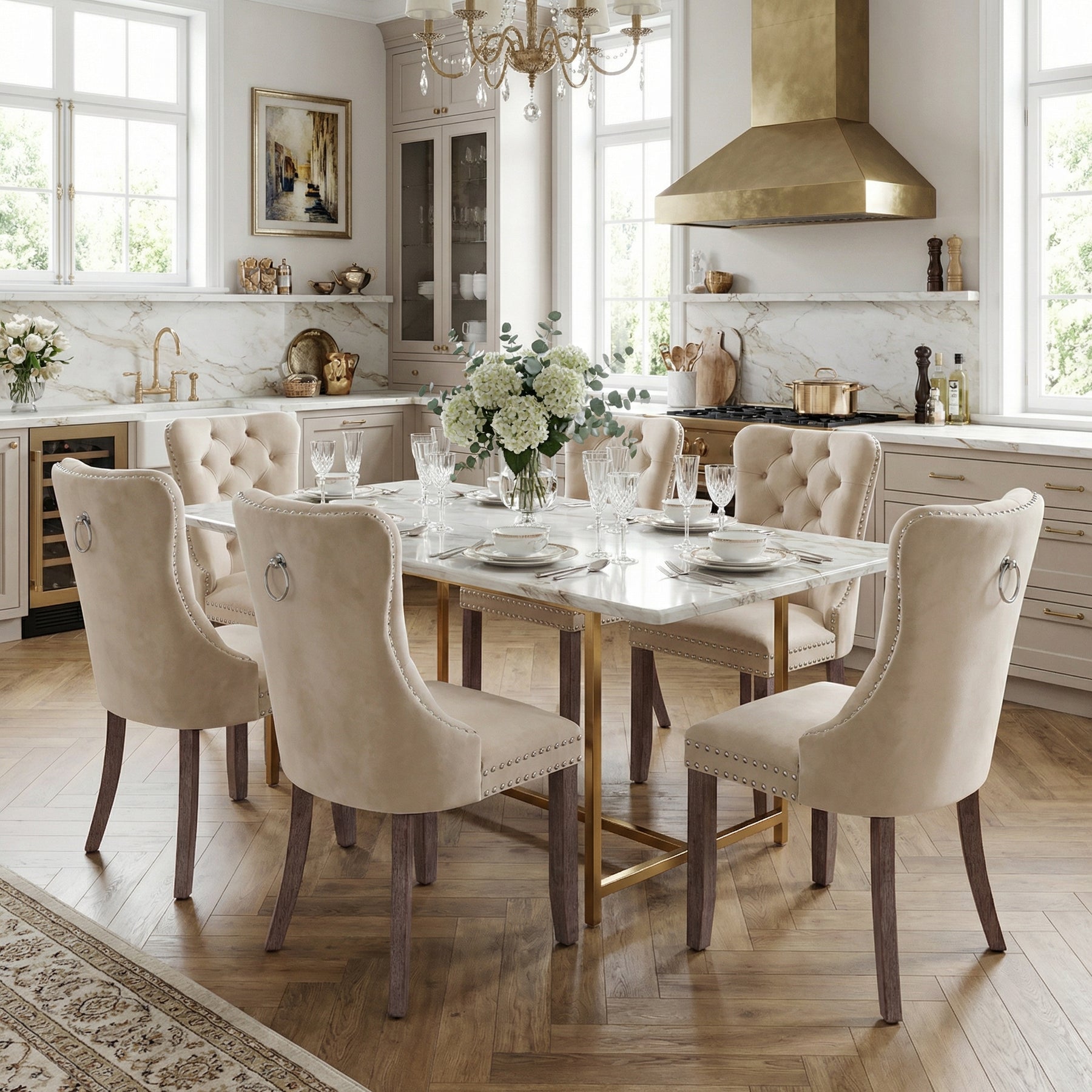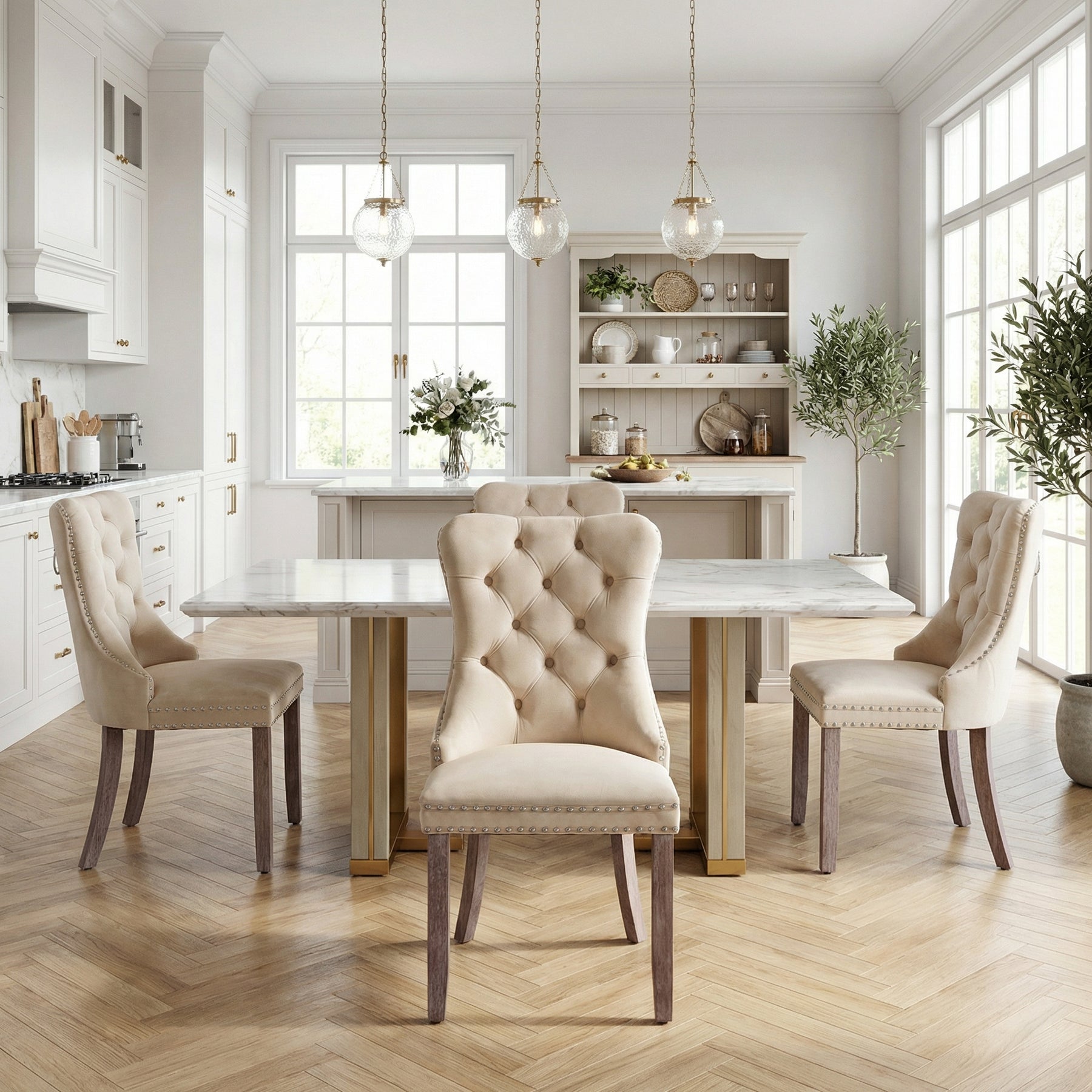 Add refined comfort and elegant character to your dining or living space with this set of 4 upholstered velvet dining chairs. Designed with a high wingback silhouette, button tufted detailing and decorative riveted trim, these chairs bring a luxurious yet welcoming feel to both modern and classic interiors. Supported by brushed solid rubber wood legs and finished with a practical knocker ring on the back, they combine visual appeal with everyday functionality, making them ideal for dining rooms, kitchens, lounges or reception areas.