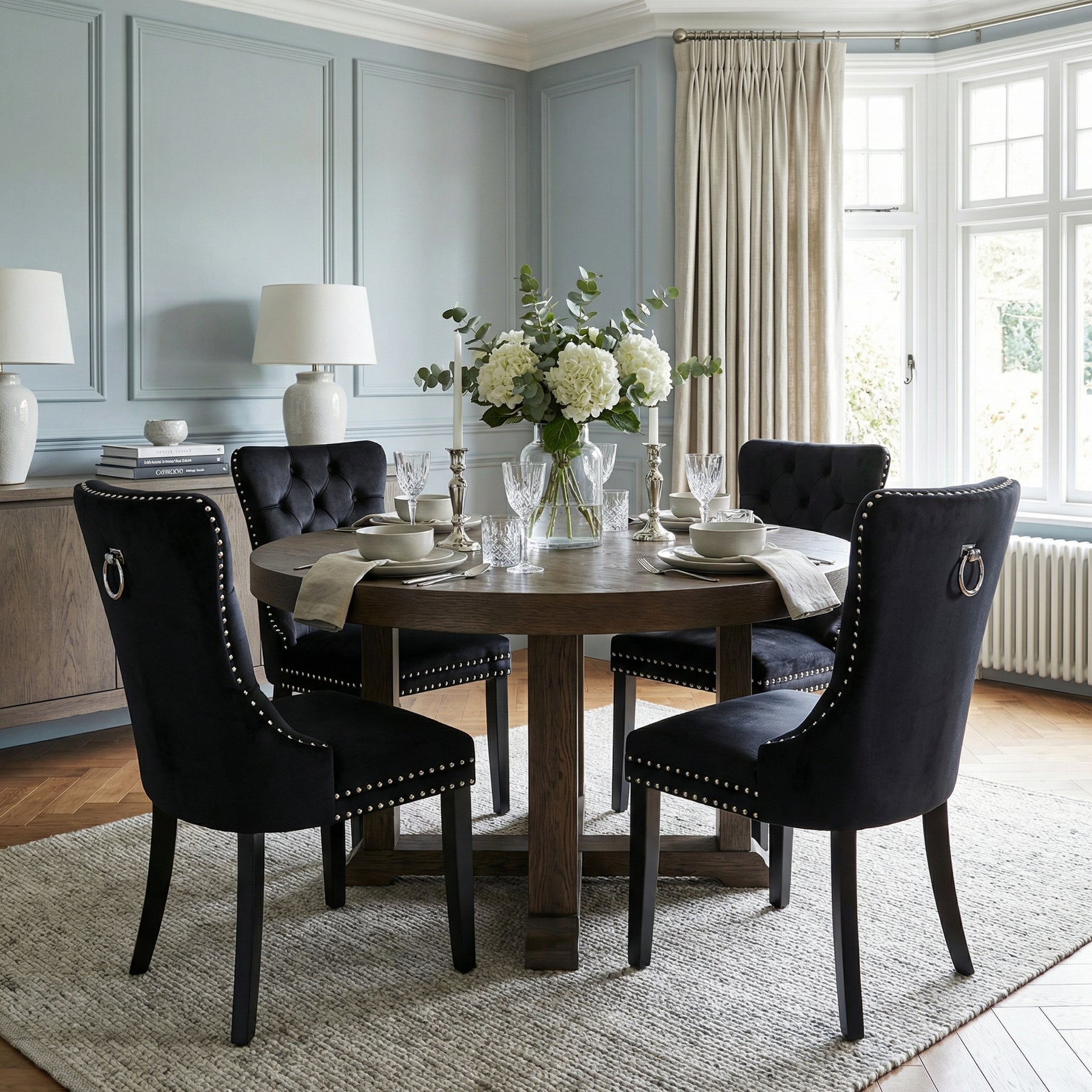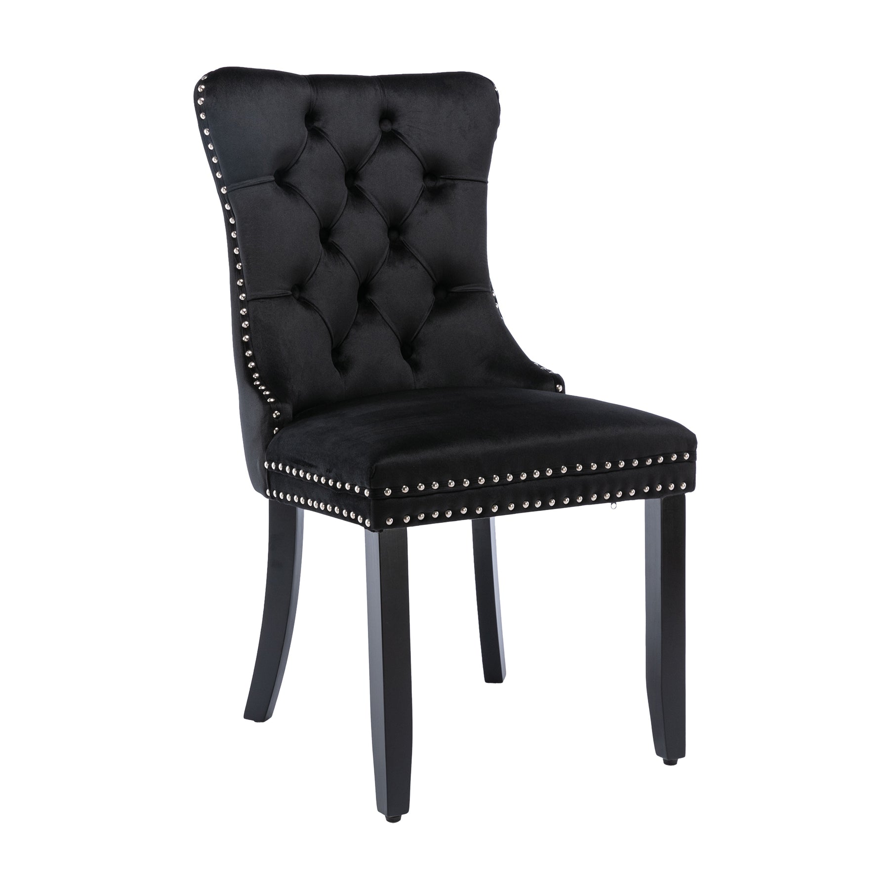Bring timeless elegance and everyday comfort to your dining or living space with this modern set of 4 upholstered velvet dining chairs. Designed with a refined wingback silhouette, deep button tufting and decorative riveted trim, these chairs add a sophisticated touch to both contemporary and classic interiors. Upholstered in soft black velvet and supported by solid rubber wood legs, they combine visual impact with reliable stability. The practical knocker ring detail on the back enhances usability while elevating the overall design, making these chairs ideal for dining rooms, kitchens, lounges or reception areas.