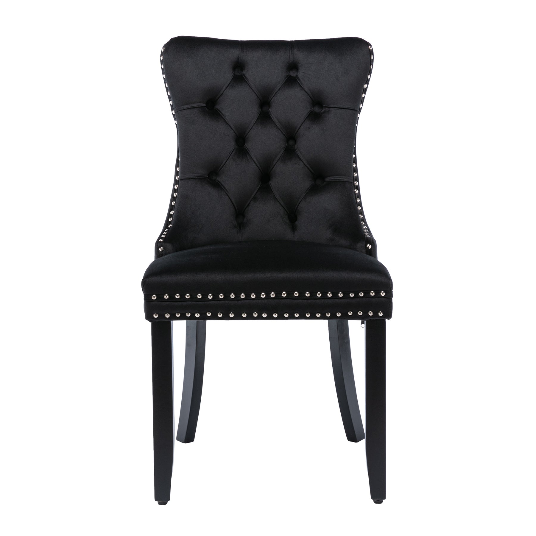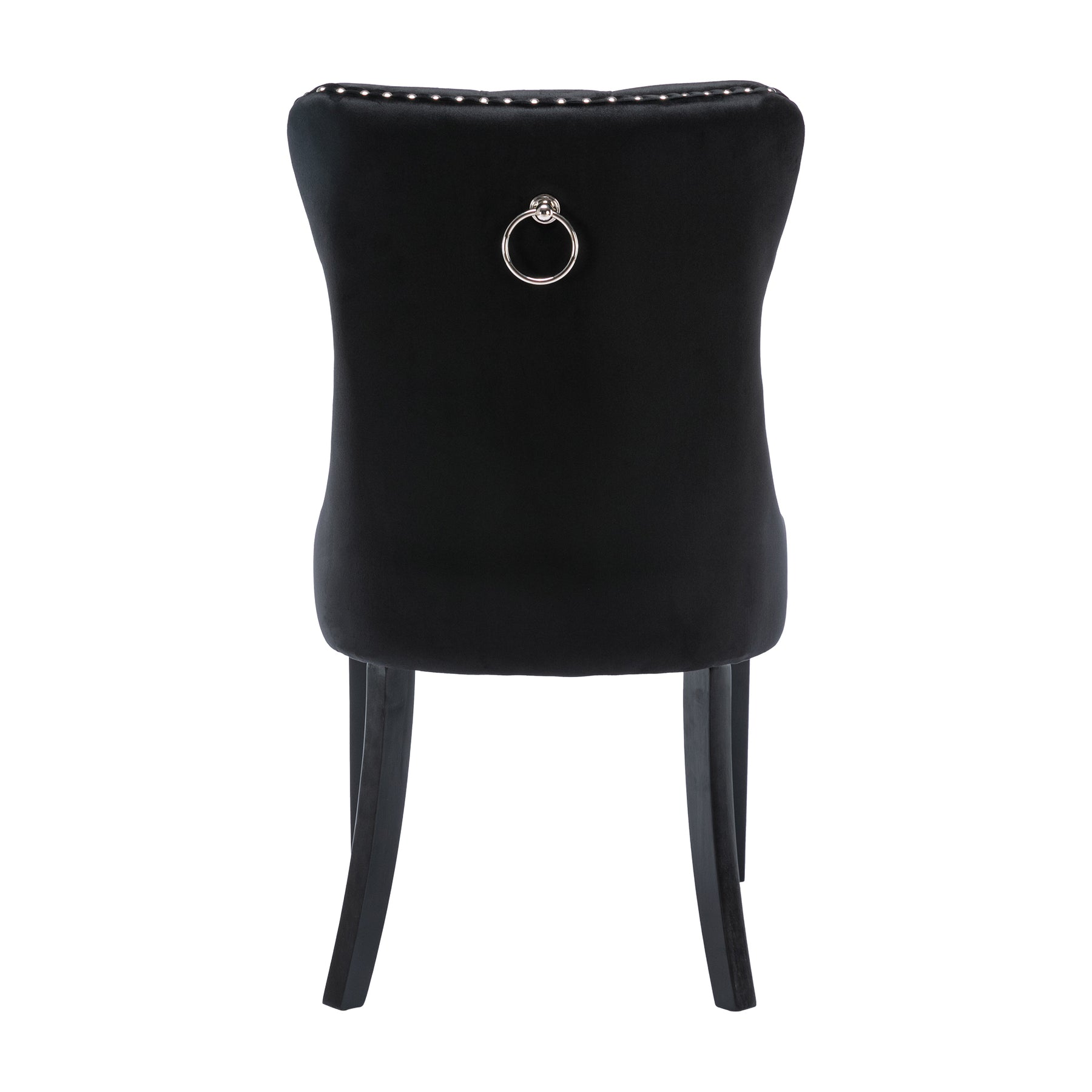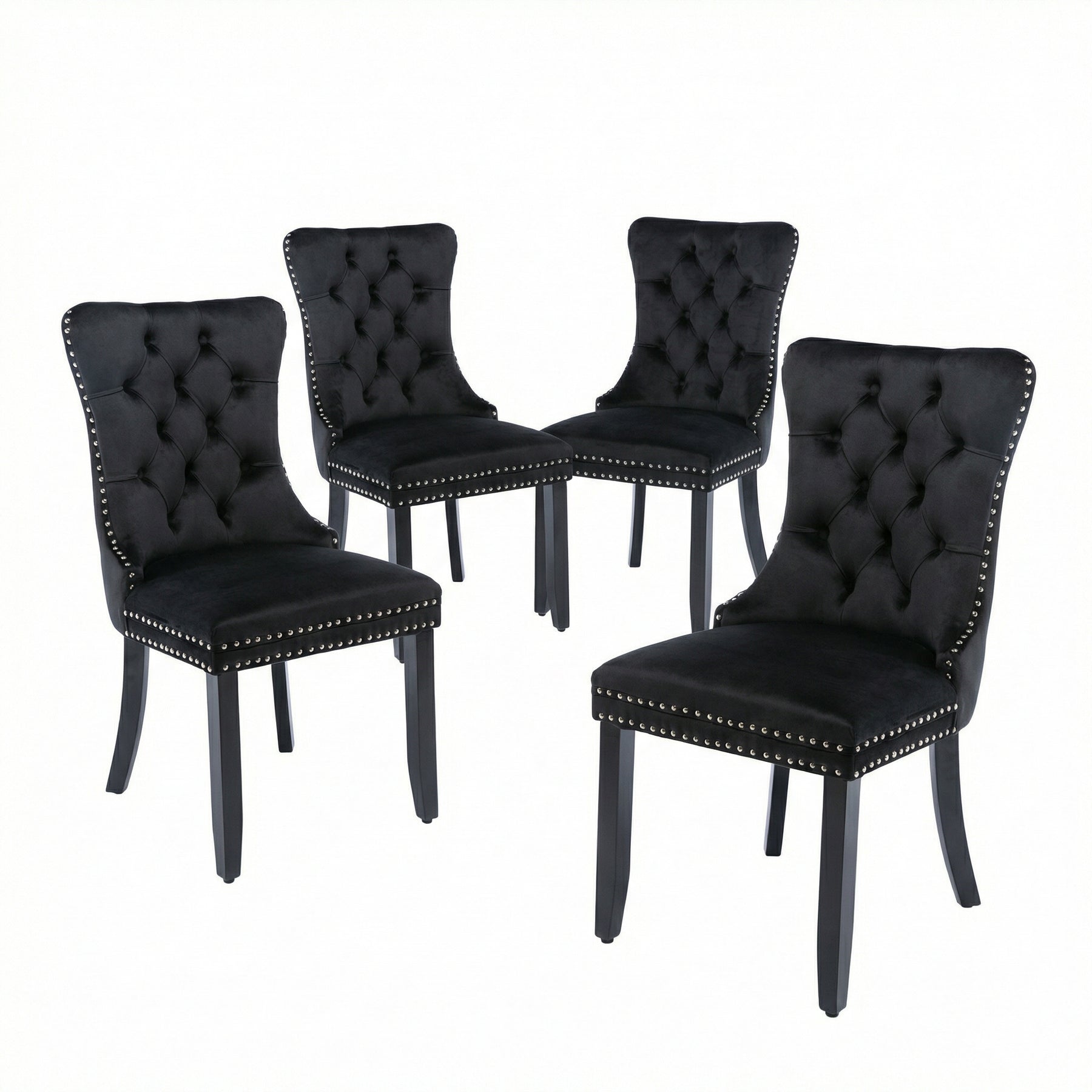 Set of 4 dining chairs velvet black tufted with solid wood legs, nailheads and back chrome ring BREEZEOLOGY
