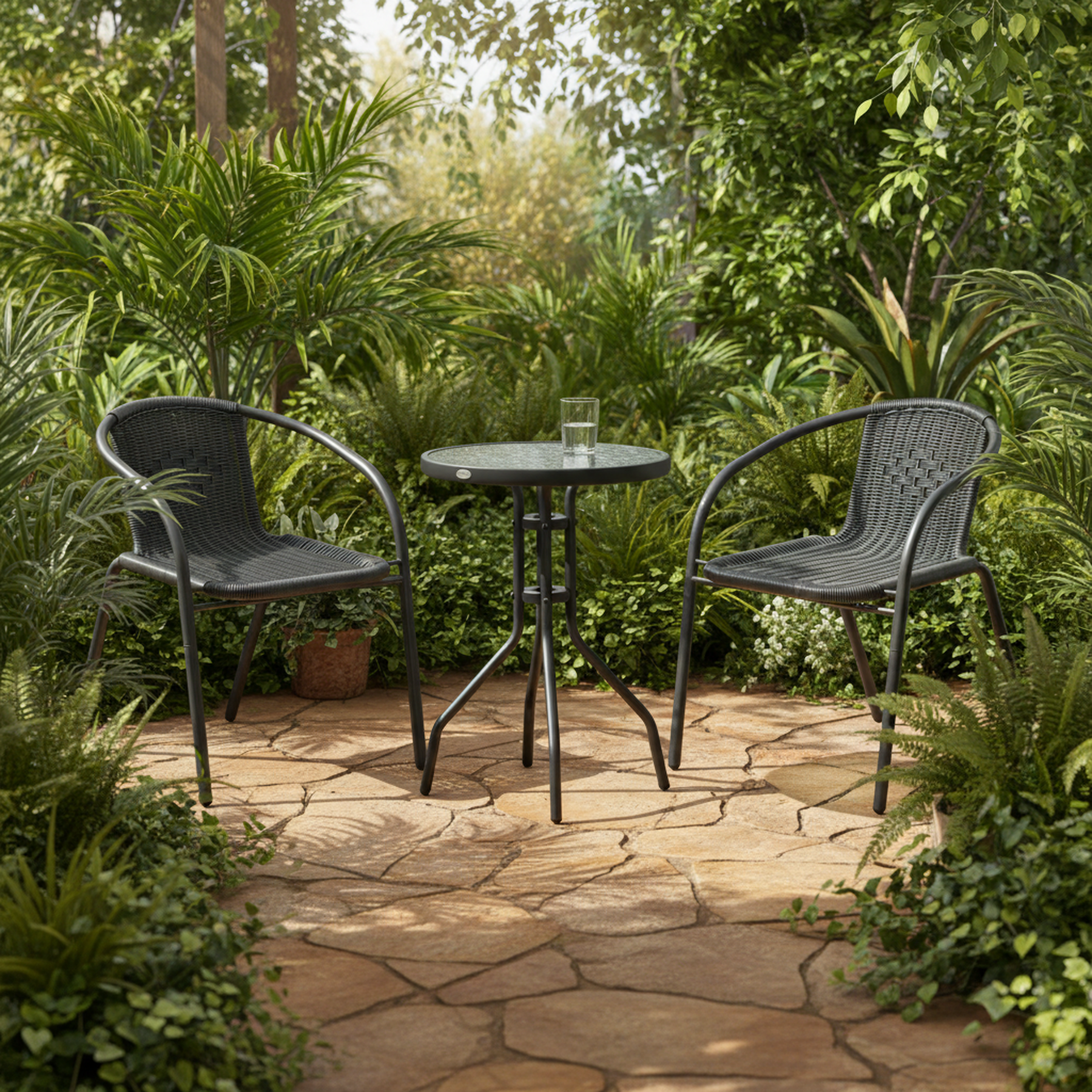 Enjoy flexible outdoor living with this 3-piece rattan bistro set, perfect for maximising small spaces like balconies, patios, or gardens. The stackable chairs and compact table make it easy to create a cosy spot for relaxing or entertaining, then store away when not in use.