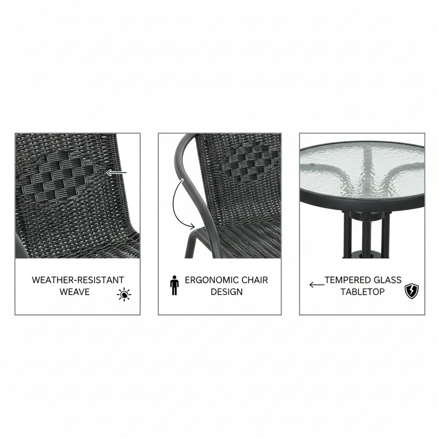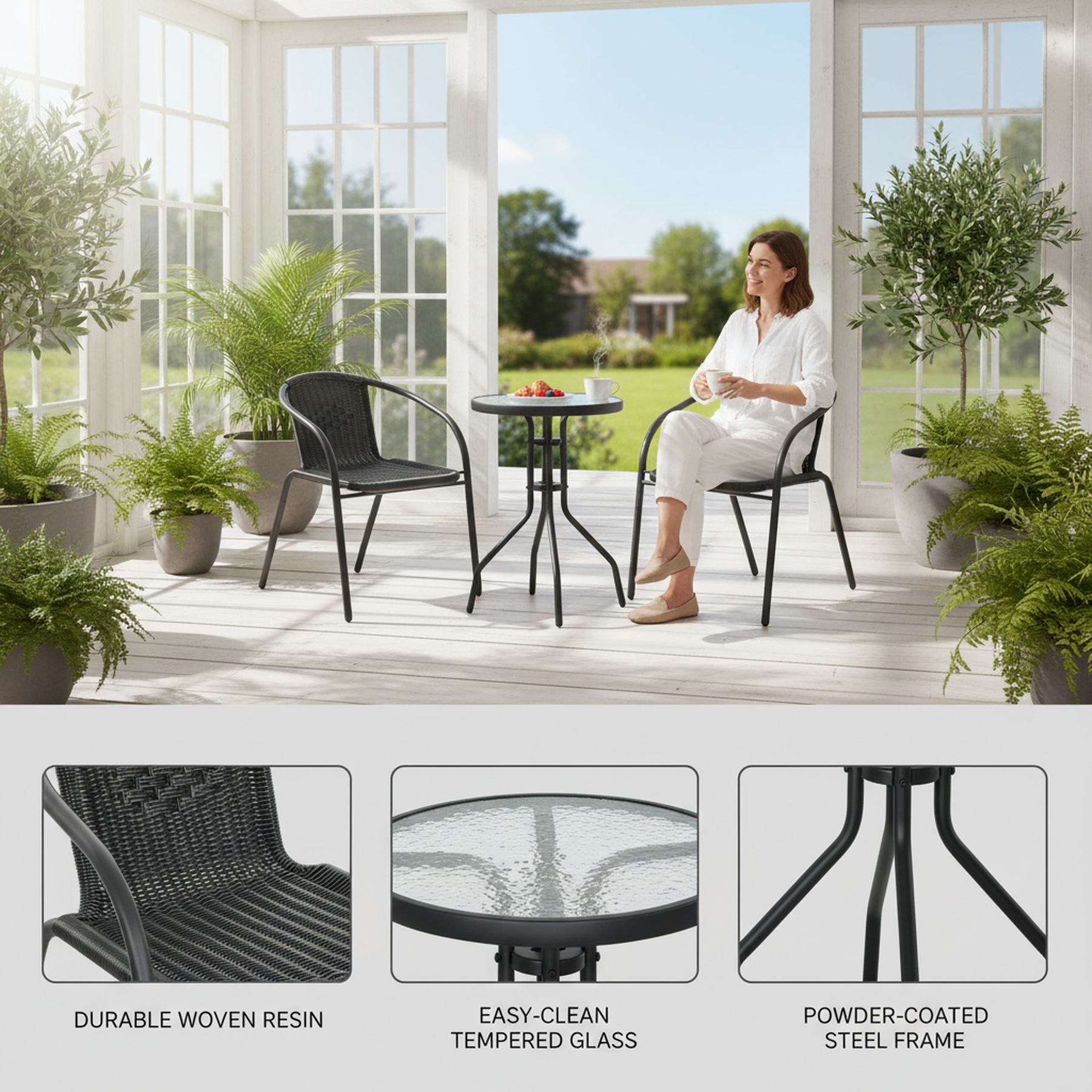 Rattan Bistro Set 3 Pieces Garden Furniture, Black, Stackable Chairs & Glass Table GROVEIUM