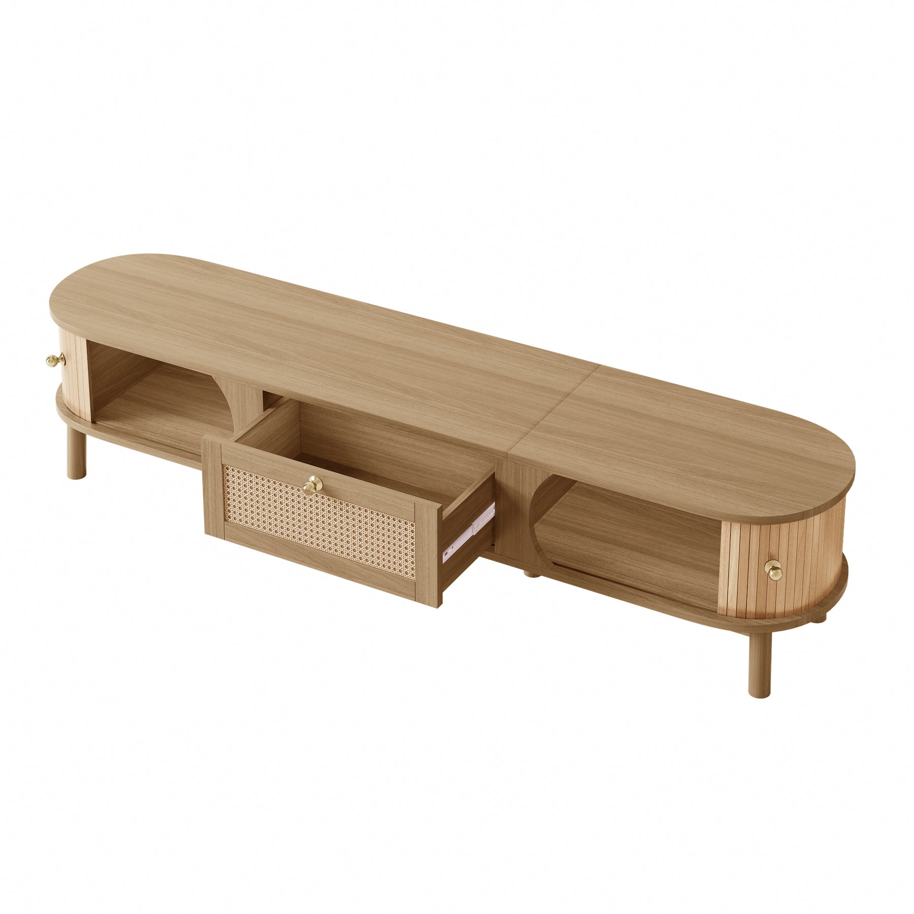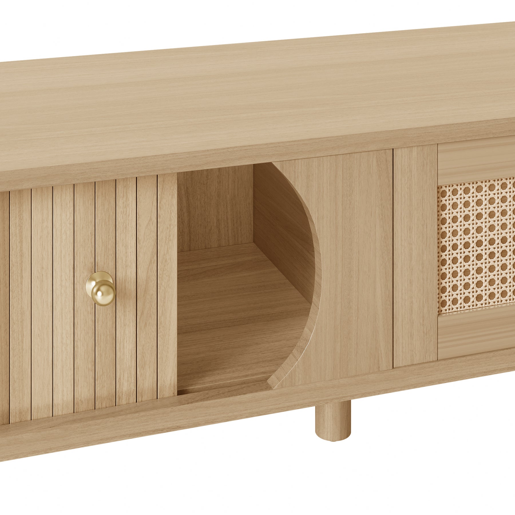Nordic oak oval TV stand with rattan inlay and slatted tambour sliding doors BLISSA