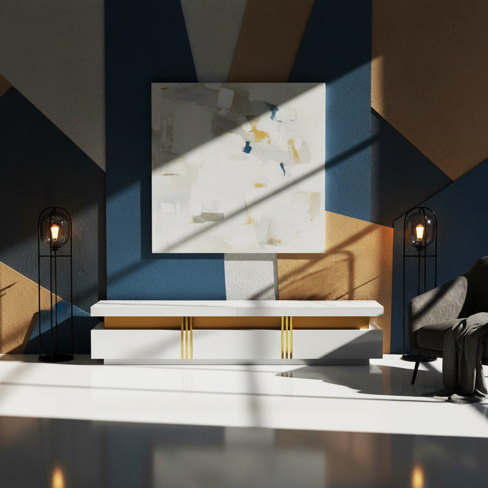 White marble pattern TV stand golden line luxury style 3 drawers VAALS UK