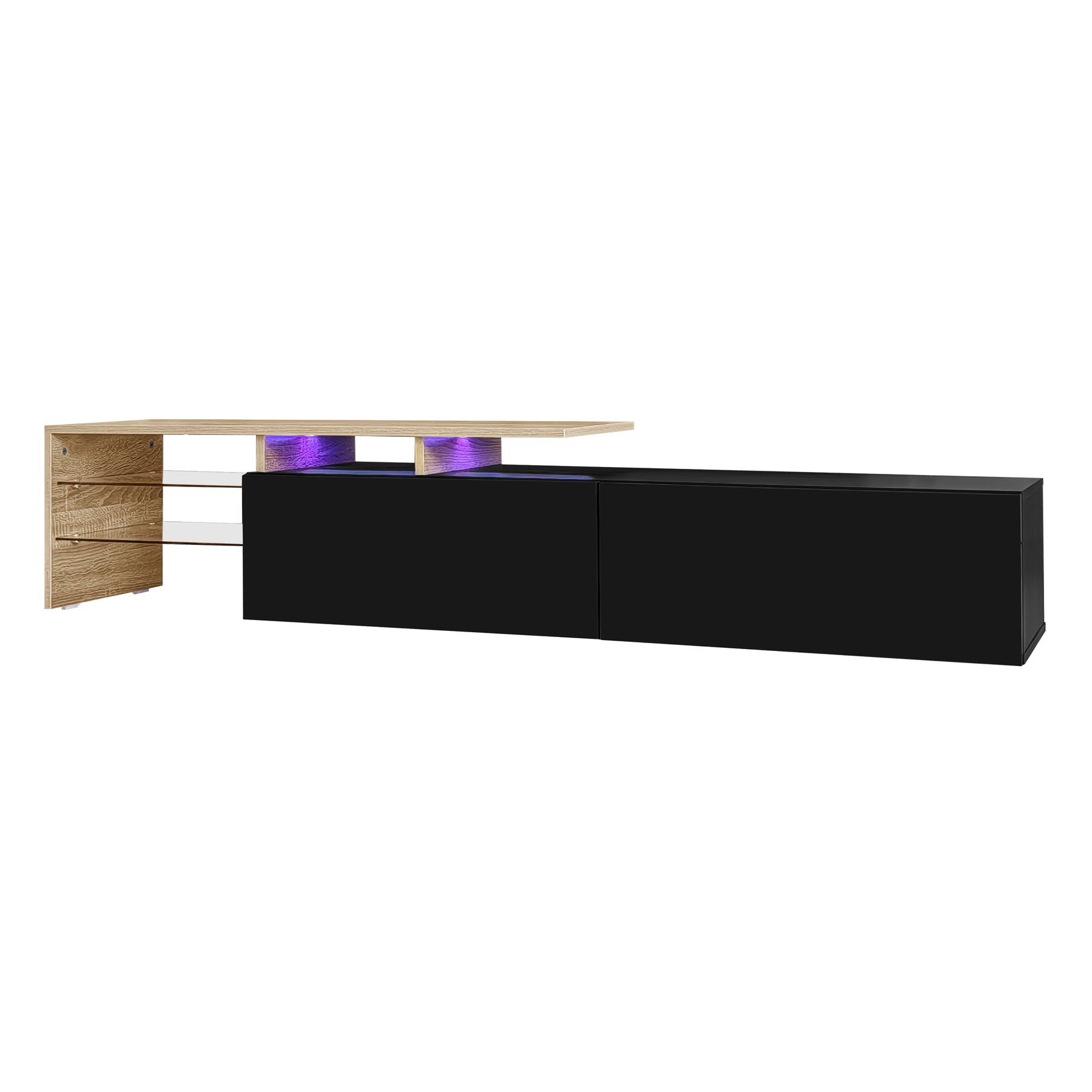 Enhance your living room with this stylish and functional 170 cm TV cabinet that blends a modern black finish with warm wood tones. Designed with clean lines, glass shelving, and integrated LED lighting, it creates a contemporary focal point for your entertainment area. With smart storage compartments and a durable construction, it provides both beauty and practicality for everyday use.